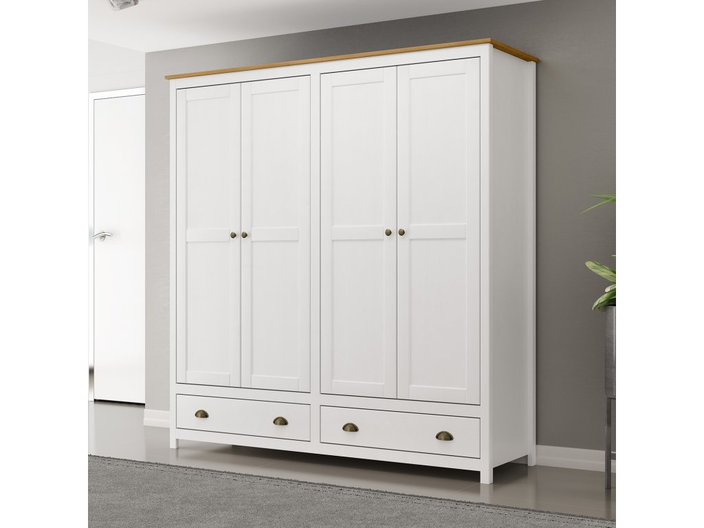 Vyrobena z masivu borovice s bílým a hnědým lakem, skříň je odolná a zároveň estetická. Povrchová úprava zajišťuje dlouhou životnost a snadnou údržbu.