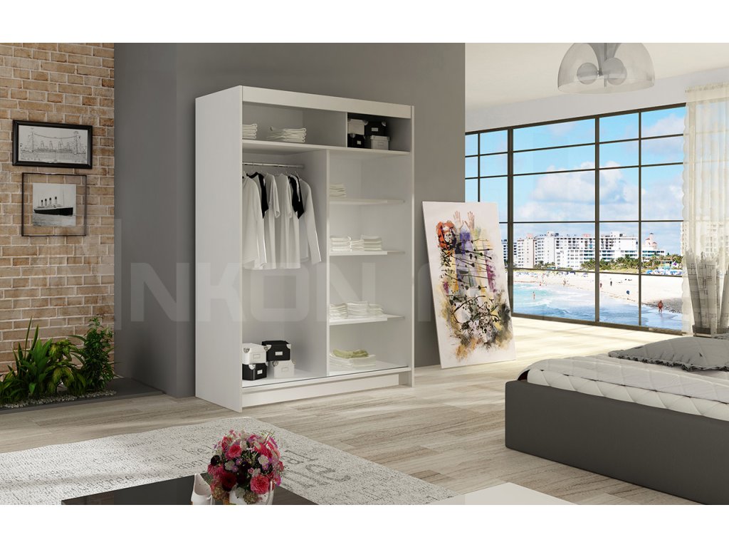Skříň je vyrobena z kvalitního lamina. Díky svému vnitřnímu uspořádání nabízí dostatek úložného prostoru, posuvné dveře šetří prostor a zrcadlo ho opticky zvětšuje. Skříň je vhodná do ložnice, dětského nebo studentského pokoje, do předsíně i kanceláře. Vnitřní uspořádání skříně je vyobrazeno na fotografii. Skříň je dodávána v demontu. Součástí je i skleněné zrcadlo, které je nalepeno na jedné části dveří skříně a také montážní plánek včetně všech potřebných spojovacích materiálů. Vyobrazené dekorace nejsou v ceně.