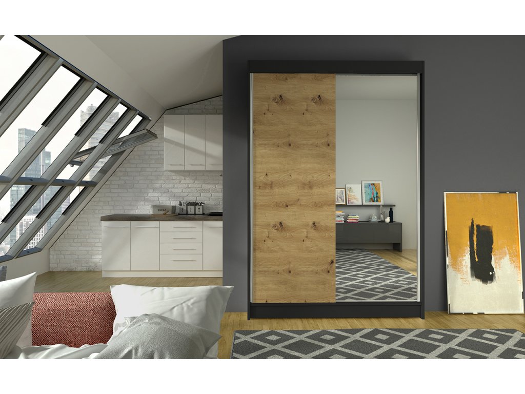 Černá posuvná skříň Linora I 120 s zrcadlem a policemi, artisan
