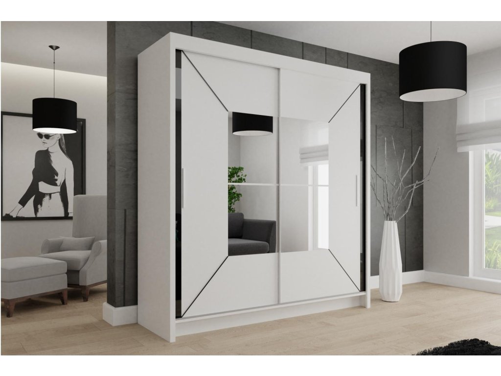 Skříň s posuvnými dveřmi Mario je vyrobena z kvalitního lamina. Dveře skříně jsou osazeny zrcadlem a na bocích jsou ozdobné pásky v černém lesku. Tyto doplňky dodávají skříni originální a elegantní vzhled. Díky svému vnitřnímu uspořádání nabízí dostatek úložného prostoru, posuvné dveře šetří prostor a zrcadlo ho opticky zvětší a prosvětlí. Skříň najde uplatnění v ložnici, dětském nebo studentském pokoji, v předsíni i kanceláři. Nabízíme ji v rozměrech 120 cm, 150 cm,180 cm a 200 cm. Všechny nabízené rozměry jsou dostupné v bílé barvě a dále také v dekoru sonoma. Skříň je dodávána v demontu a součástí je montážní plánek včetně všech potřebných spojovacích prvků. Vyobrazené dekorace nejsou v ceně.