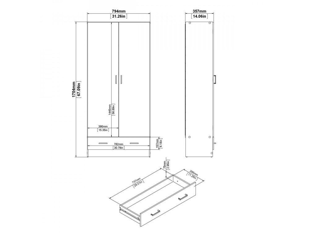 Skříň má výšku 170 cm, šířku 80 cm a hloubku 36 cm, což ji činí kompaktní a vhodnou i do menších prostor.