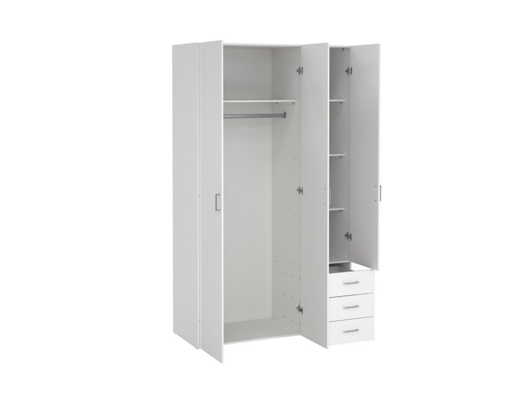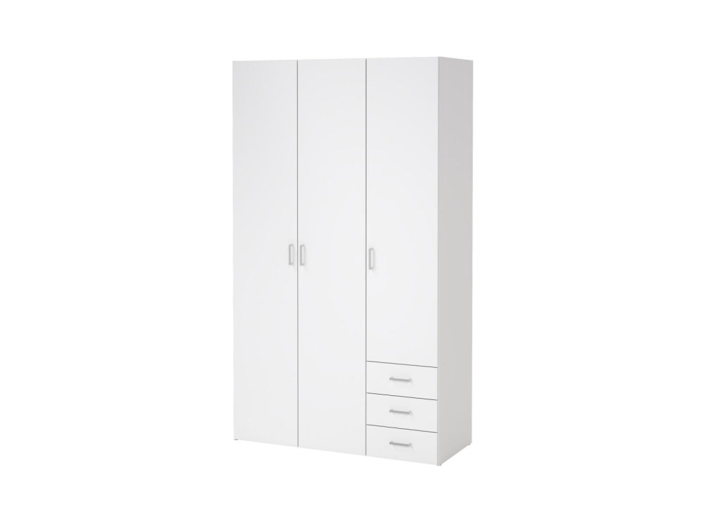 Skříň nabízí kombinaci prostoru za třemi dveřmi a třemi zásuvkami, což umožňuje efektivní uspořádání oblečení i menších doplňků.