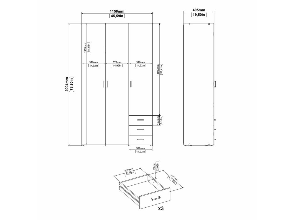 Skříň má výšku přibližně 200 cm, šířku kolem 116 cm a hloubku necelých 50 cm, což ji činí vhodnou i do menších prostor.