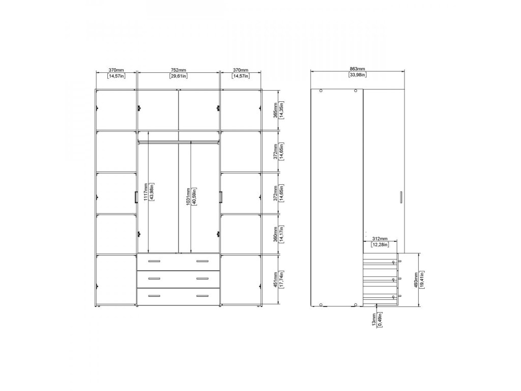 Skříň Sid 4d3s nabízí dostatek prostoru pro oblečení i doplňky díky kombinaci polic a šatní tyče. Vhodná je do ložnice i předsíně pro přehledné uspořádání.