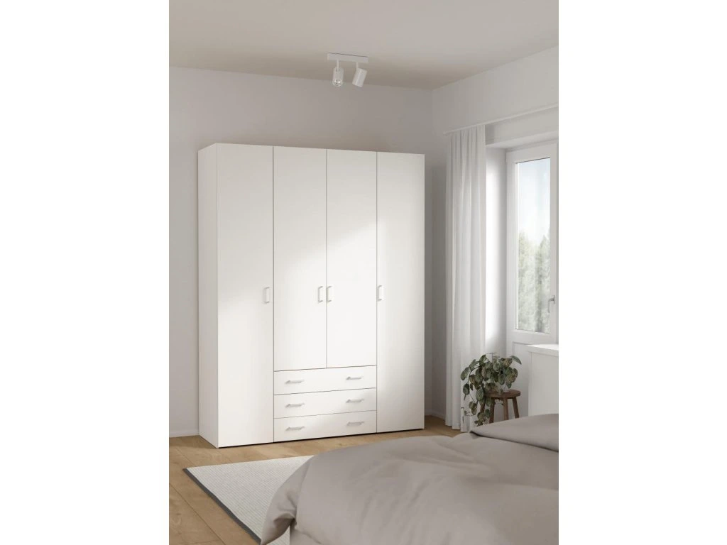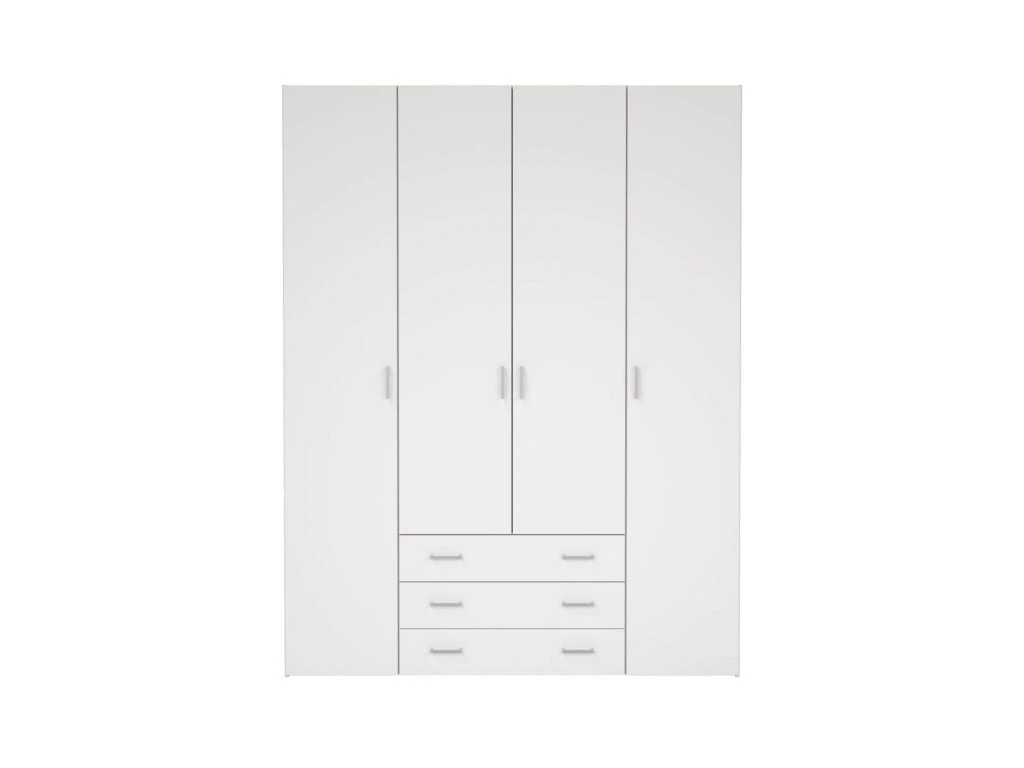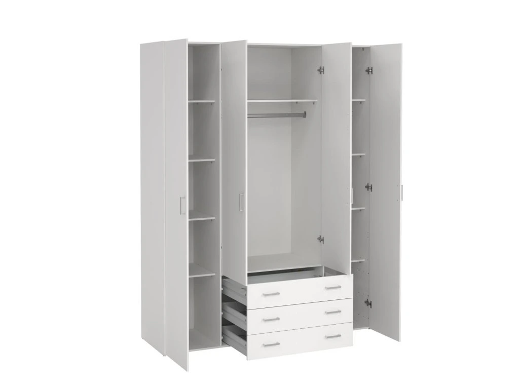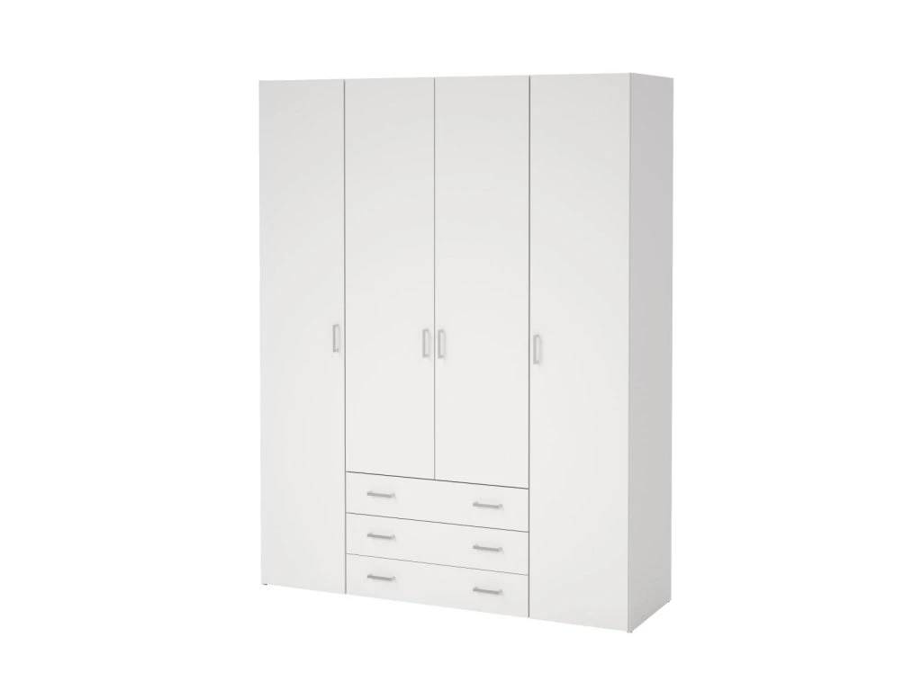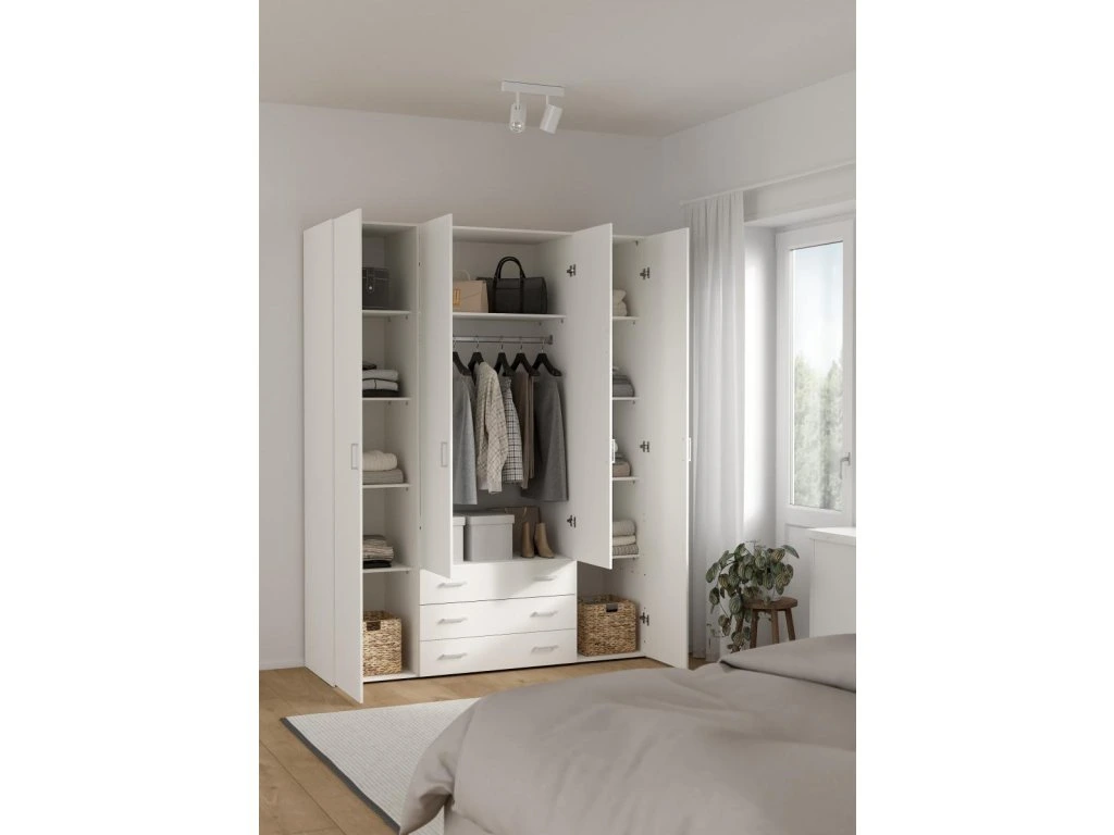 Skříň Sid 4d3s v bílé barvě nabízí dostatek prostoru pro oblečení i doplňky díky kombinaci polic a šatní tyče. Je vhodná pro organizaci šatníku v moderních i klasických interiérech.
