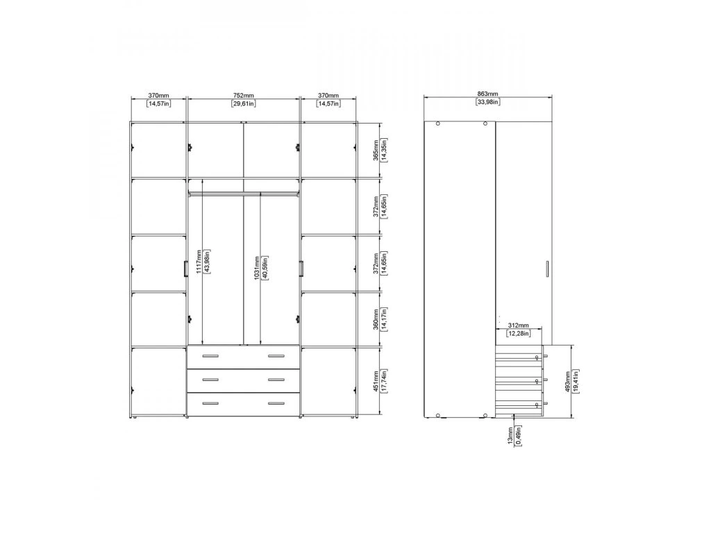 Skříň nabízí kombinaci polic a šatní tyče, což umožňuje uskladnit různé druhy oblečení a doplňků přehledně a efektivně.