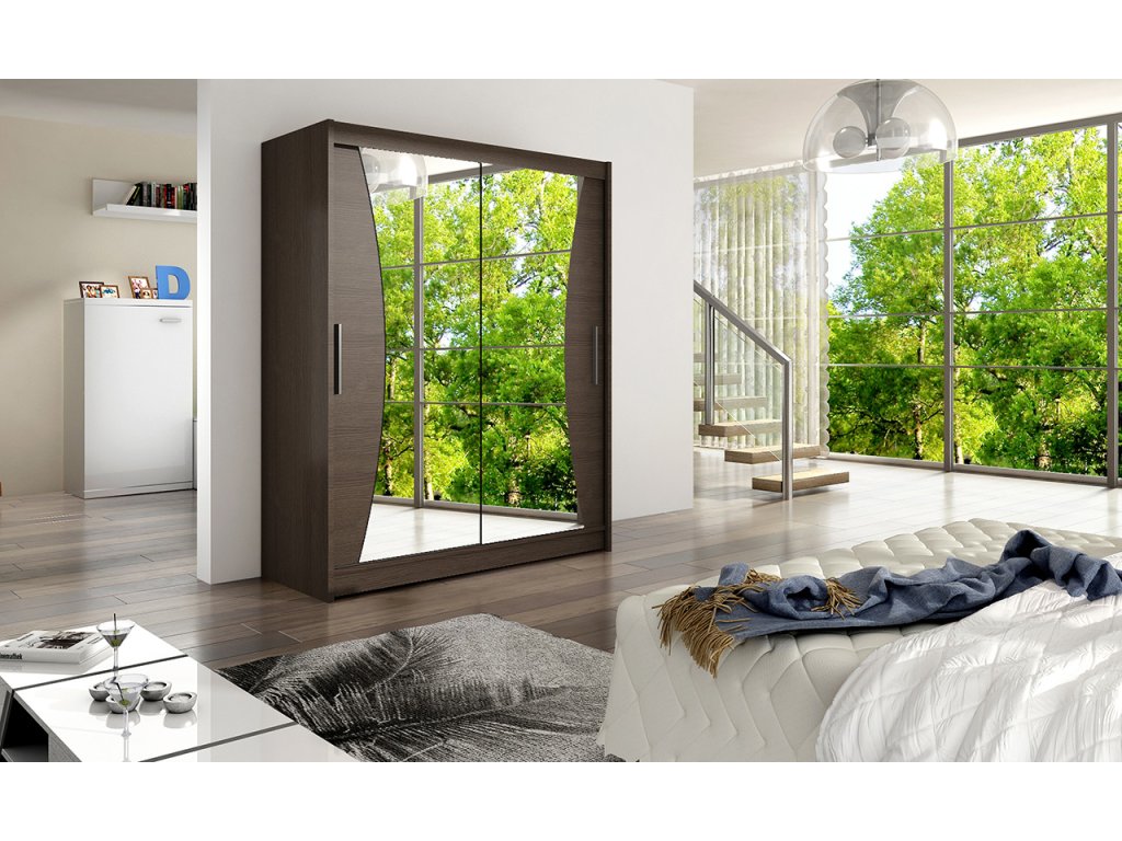 Jednoduchý a elegantní design skříně osloví i náročné zákazníky. Eleganci podtrhují dlouhé stříbrné úchyty a součástí jsou i skleněná zrcadla, která jsou nalepena na dveřích skříně a po stranách zaříznutá do oblouku. Je vyrobena z lamina o síle 16 mm a hrany jsou ukončeny ABS lištou. Vodící lišty jsou vyrobeny z odolného hliníku a splňují požadavky pro každodenní užívání. Díky svému uspořádání poskytuje dostatek úložného prostoru a zrcadlo prostor opticky zvětší a prosvětlí. Skvěle se hodí do ložnice, předsíně, dětského, nebo studentského pokoje. Skříň je dodávána v demontu a součástí je montážní plánek včetně všech potřebných spojovacích materiálů. Vyobrazené dekorace nejsou v ceně.