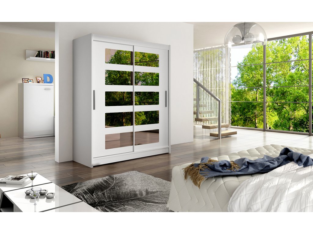 Jednoduchý a elegantní design skříně osloví i náročné zákazníky. Eleganci podtrhují dlouhé stříbrné úchyty a součástí jsou i skleněná, kouřová zrcadla, která jsou nalepena na dveřích skříně. Je vyrobena z lamina o síle 16 mm a hrany jsou ukončeny ABS lištou. Vodící lišty jsou vyrobeny z odolného hliníku a splňují požadavky pro každodenní užívání. Díky svému uspořádání poskytuje dostatek úložného prostoru. Skvěle se hodí do ložnice, předsíně, dětského, nebo studentského pokoje. Skříň je dodávána v demontu a součástí je montážní plánek včetně všech potřebných spojovacích materiálů. Vyobrazené dekorace nejsou v ceně.