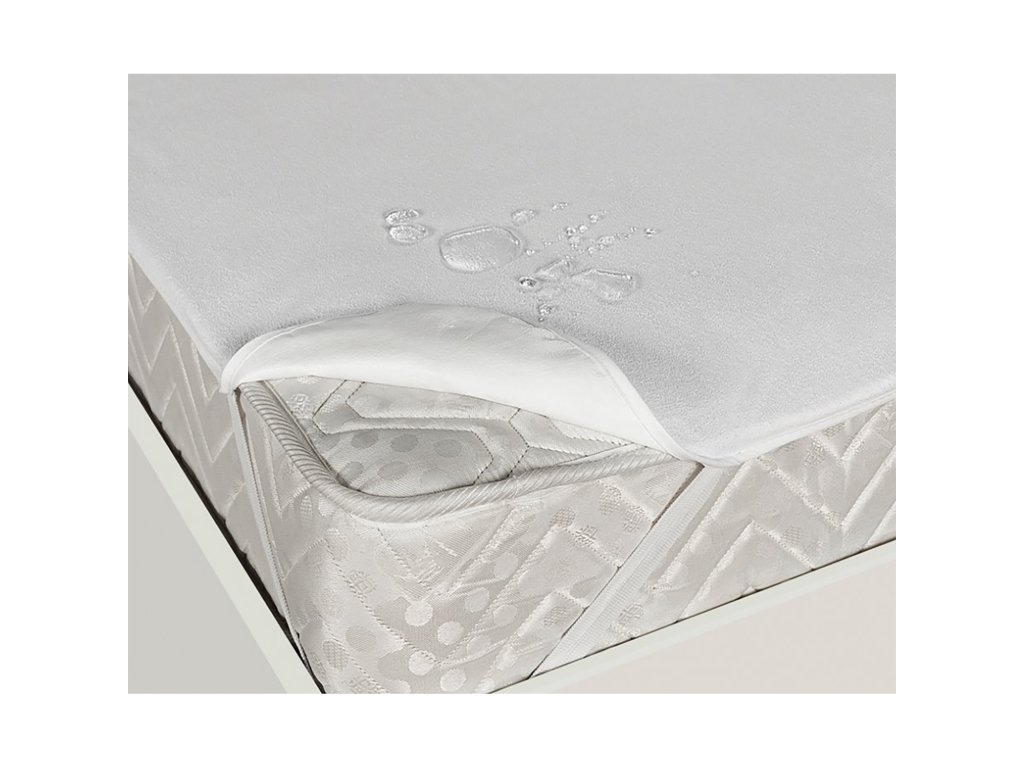 Horní vrstva je froté 70% bavlna a 30% polyester, spodní vrstva polyuretan. Barevné provedení je bílá, gumy jsou všité v rozích pro pevné uchycení.