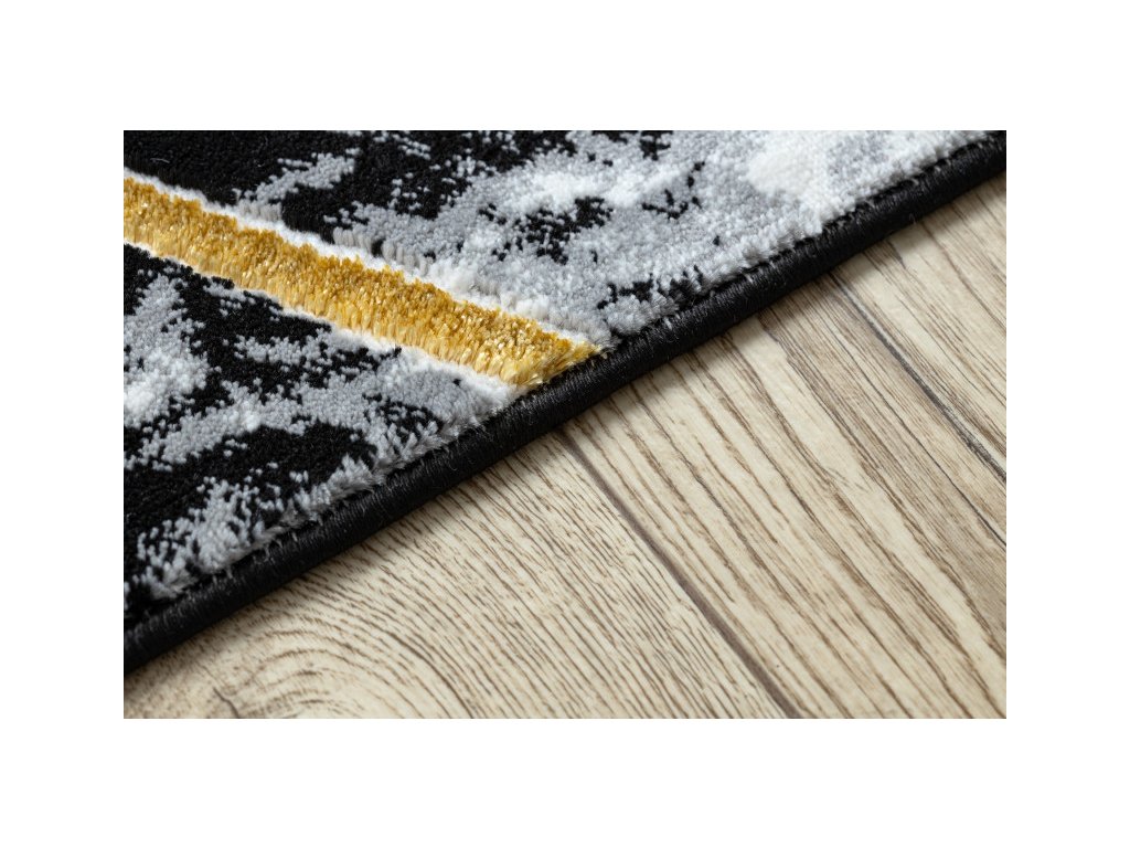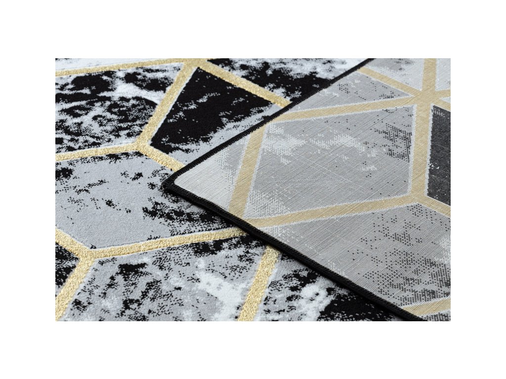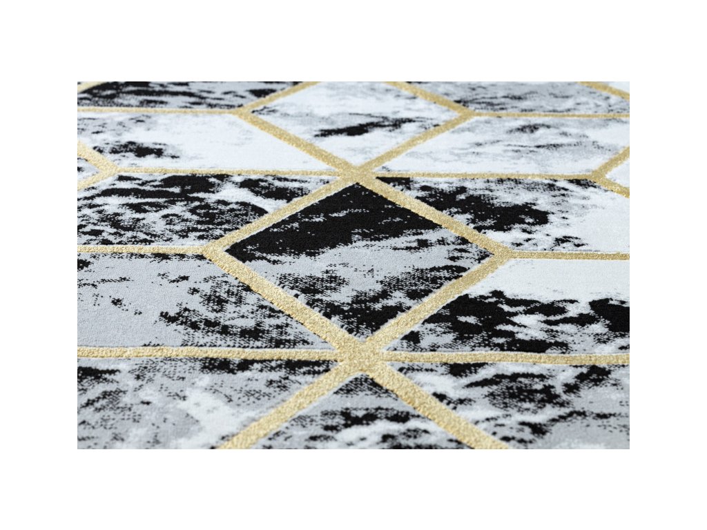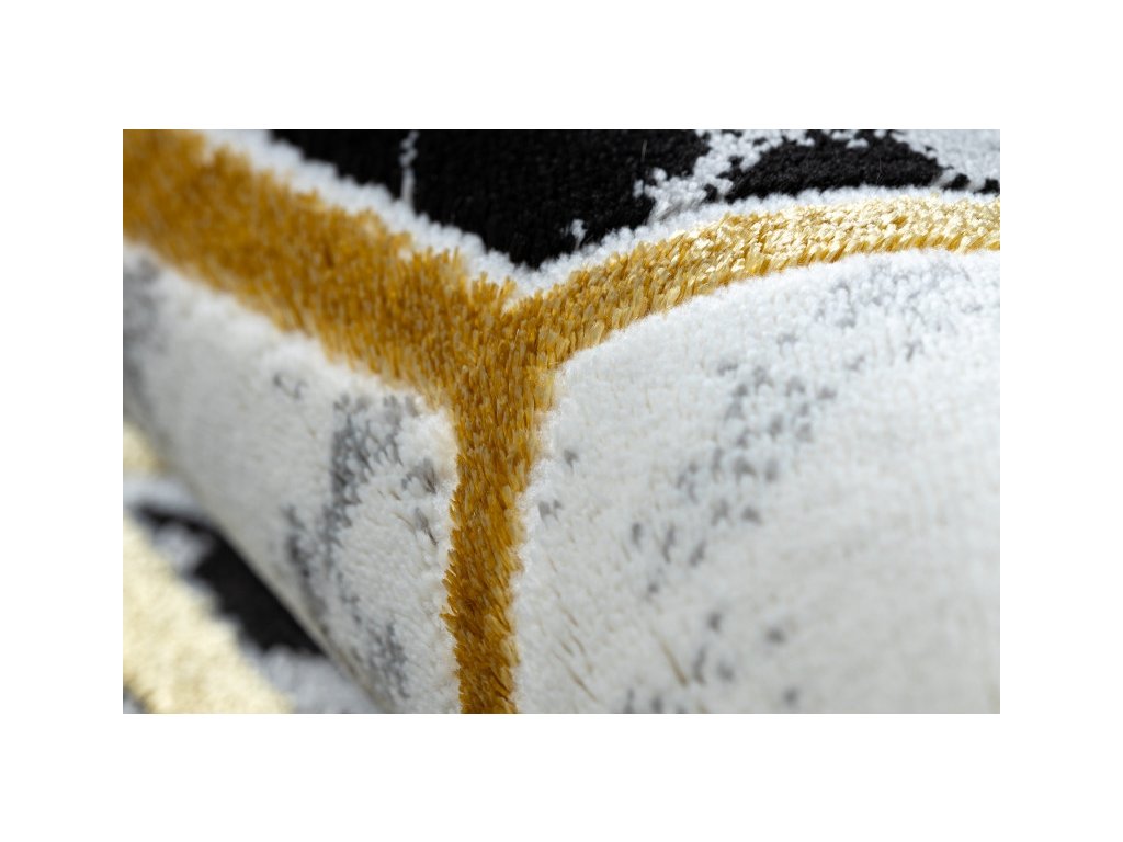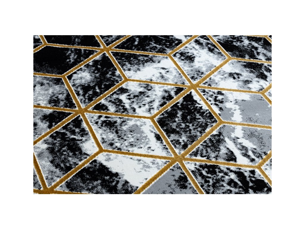 Kusový koberec Gloss 409A nabízí výrazný geometrický vzor kostek v černé, zlaté a šedé barvě s 3D efektem. Vytváří stylový středobod v interiéru, vhodný pro glamour a art deco styl.