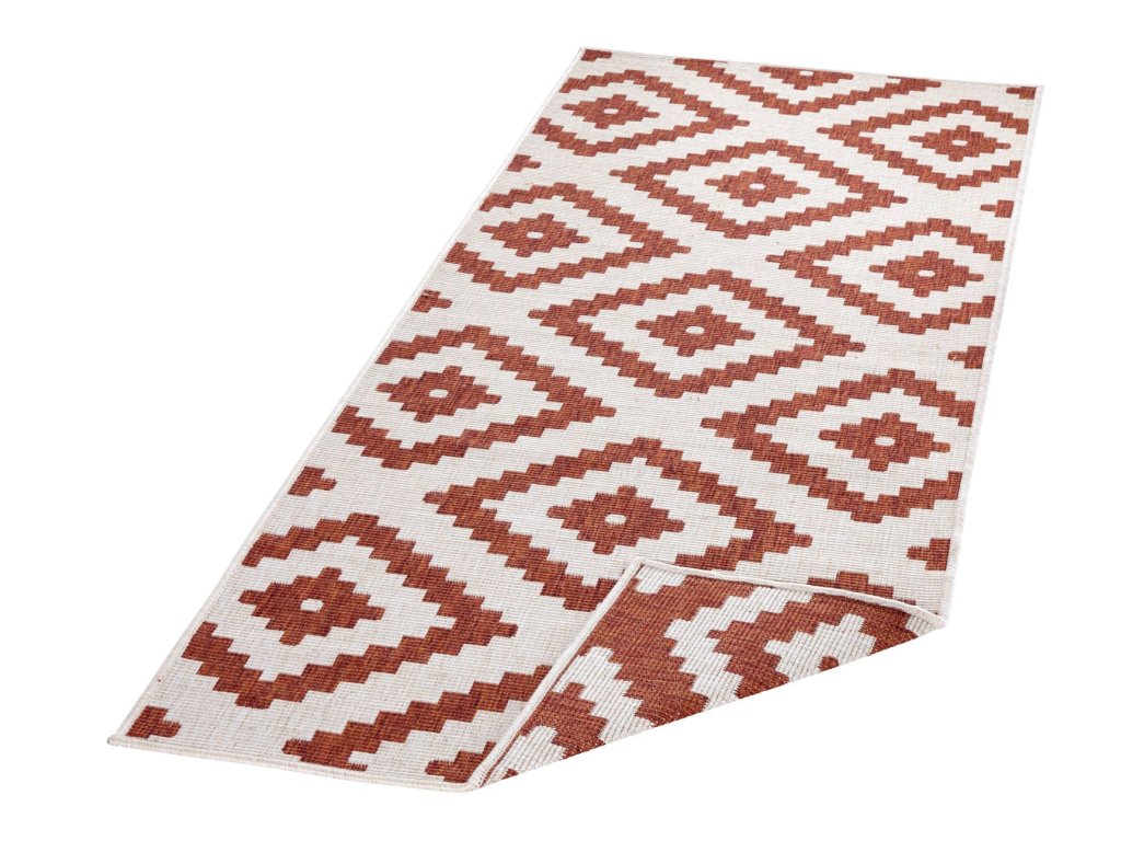 Oboustranný kusový koberec vhodný do interiéru i exteriéru, například do obývacího pokoje, ložnice nebo na terasu. Snadno se udržuje a odolává venkovním podmínkám.
