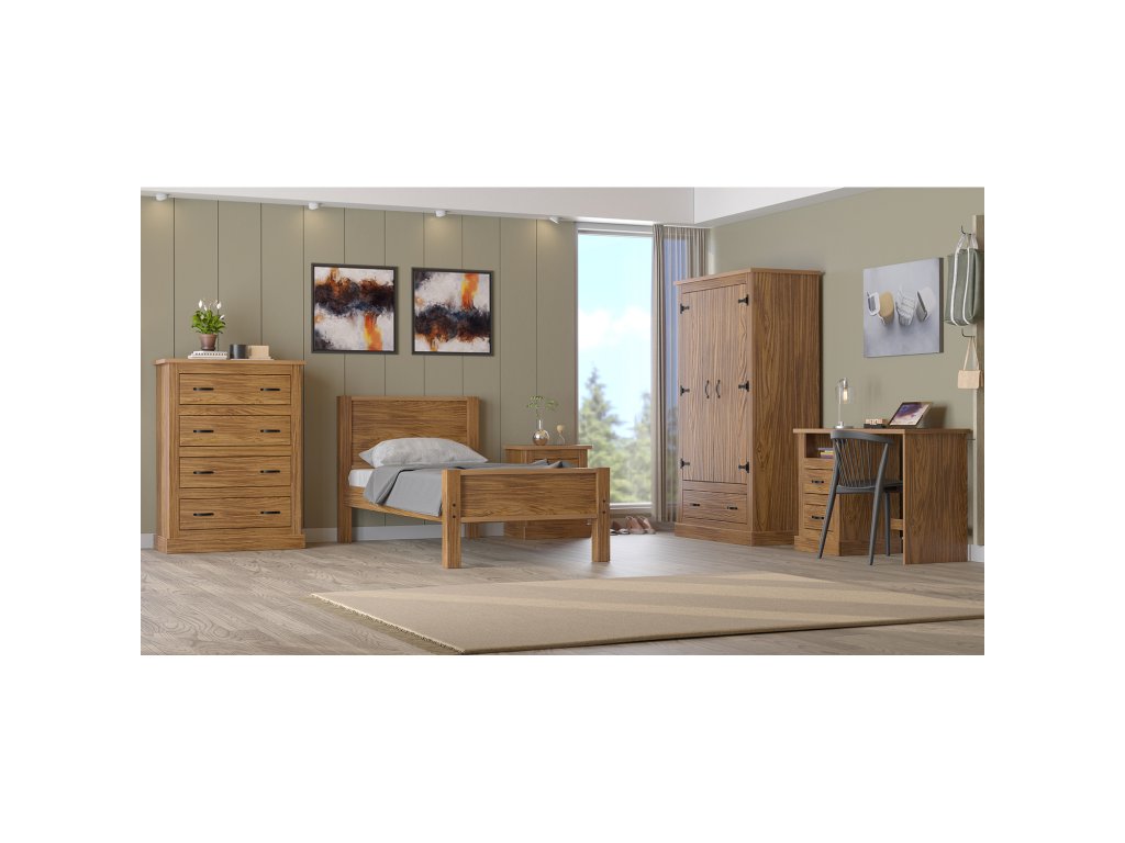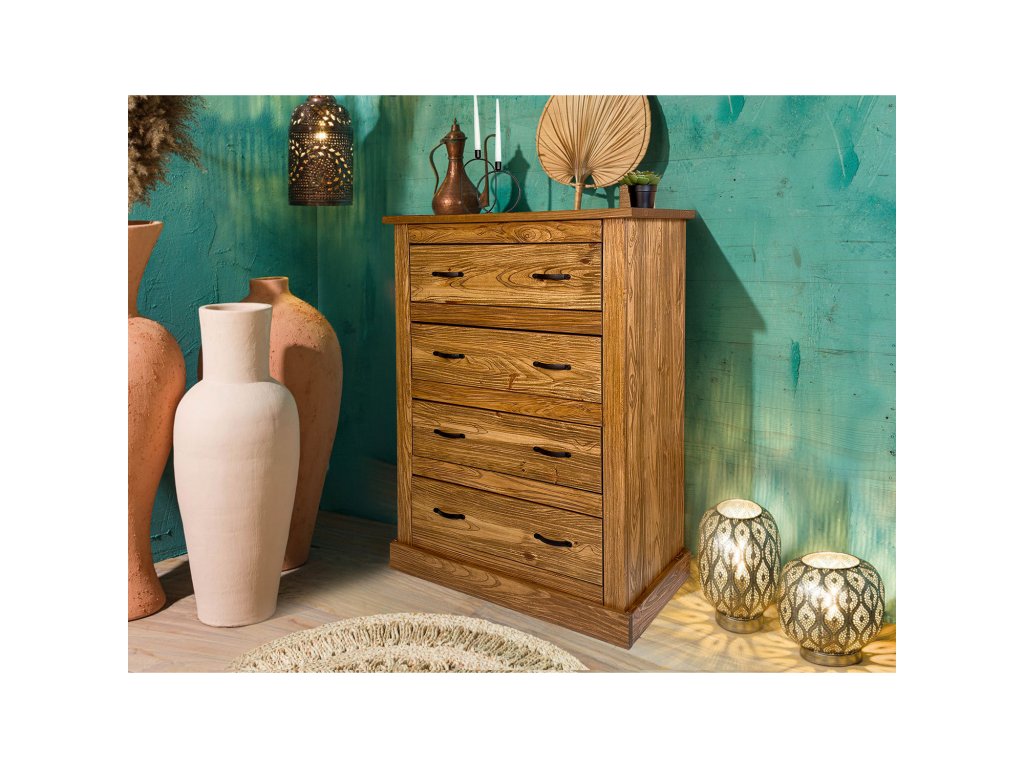 Komoda EL DORADO s čtyřmi zásuvkami je ideální pro uspořádání oblečení, doplňků nebo drobných předmětů v ložnici, obývacím pokoji či předsíni. Vyrobena z masivní borovice v provedení dub antik, je odolná a snadno udržitelná.