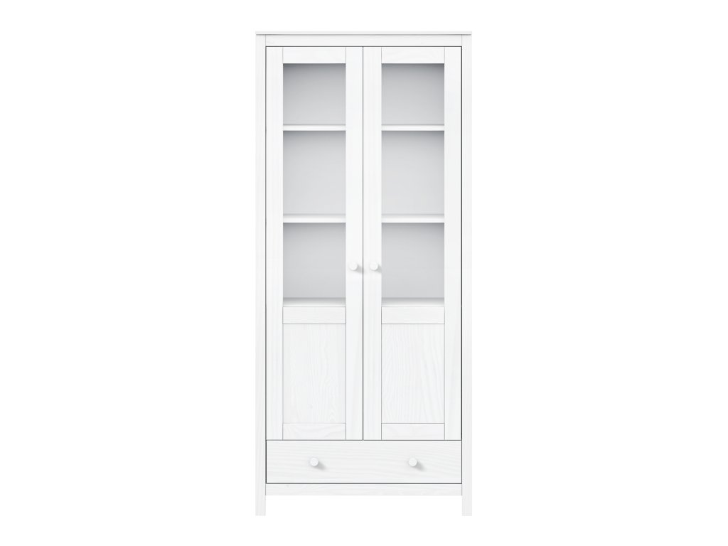Vyrobena z masivu borovice s bílým lakem, vitrína je odolná a snadno se udržuje. Světlý odstín se hodí do moderních i klasických interiérů a opticky zvětšuje prostor.