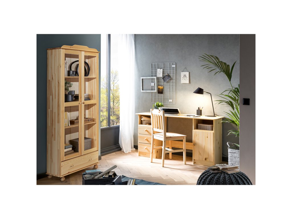 Vyrobena z lakované masivní borovice, vitrína zaručuje pevnost a dlouhou životnost. Povrchová úprava chrání dřevo a usnadňuje údržbu.