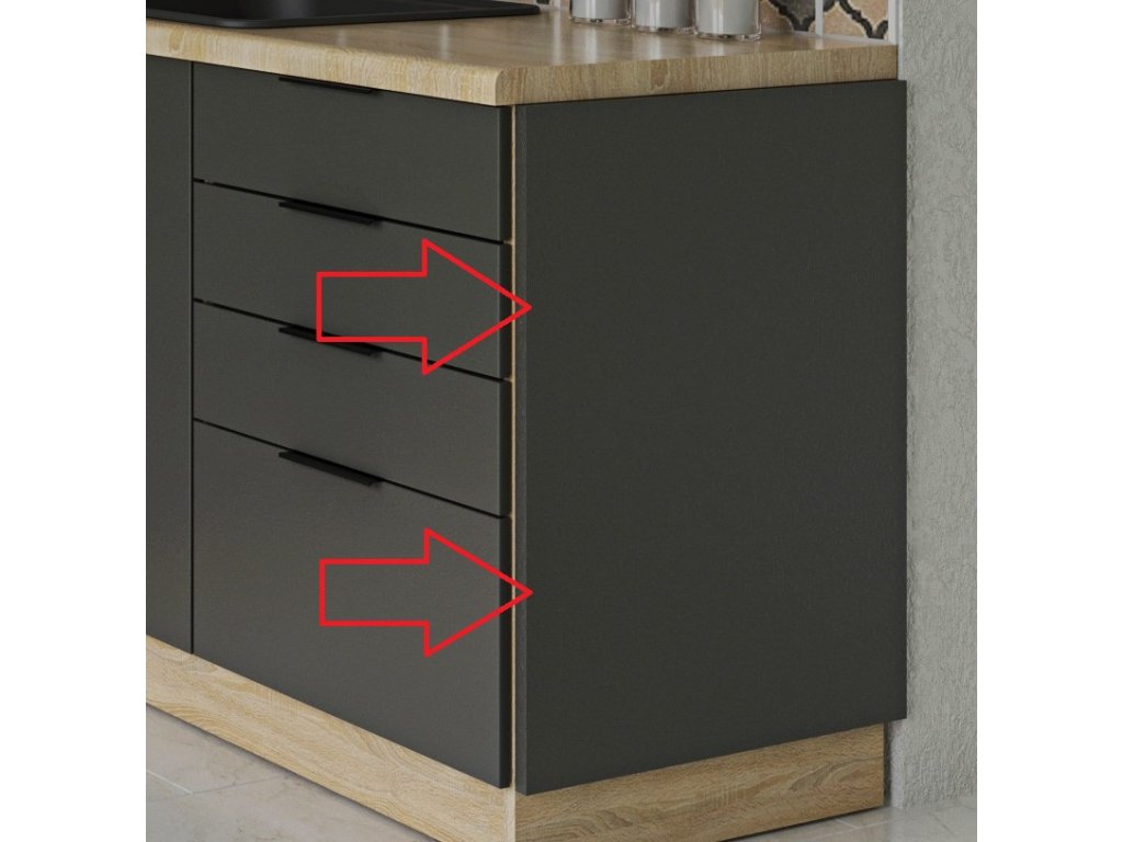 Boční panel Blenda s šířkou 55 cm a výškou 71 cm je určený k zakrytí boků kuchyňských sestav Modena. Vhodný pro zakrytí a sjednocení vzhledu kuchyně.