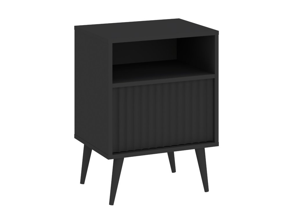 Originální noční stolek na nožičkách s otevřenou policí upoutá pozornost svým moderním designem, matným provedením a stylovými nožičkami. Je vyrobena z kvalitní laminované desky, která je odolná a snadno se udržuje v čistotě.