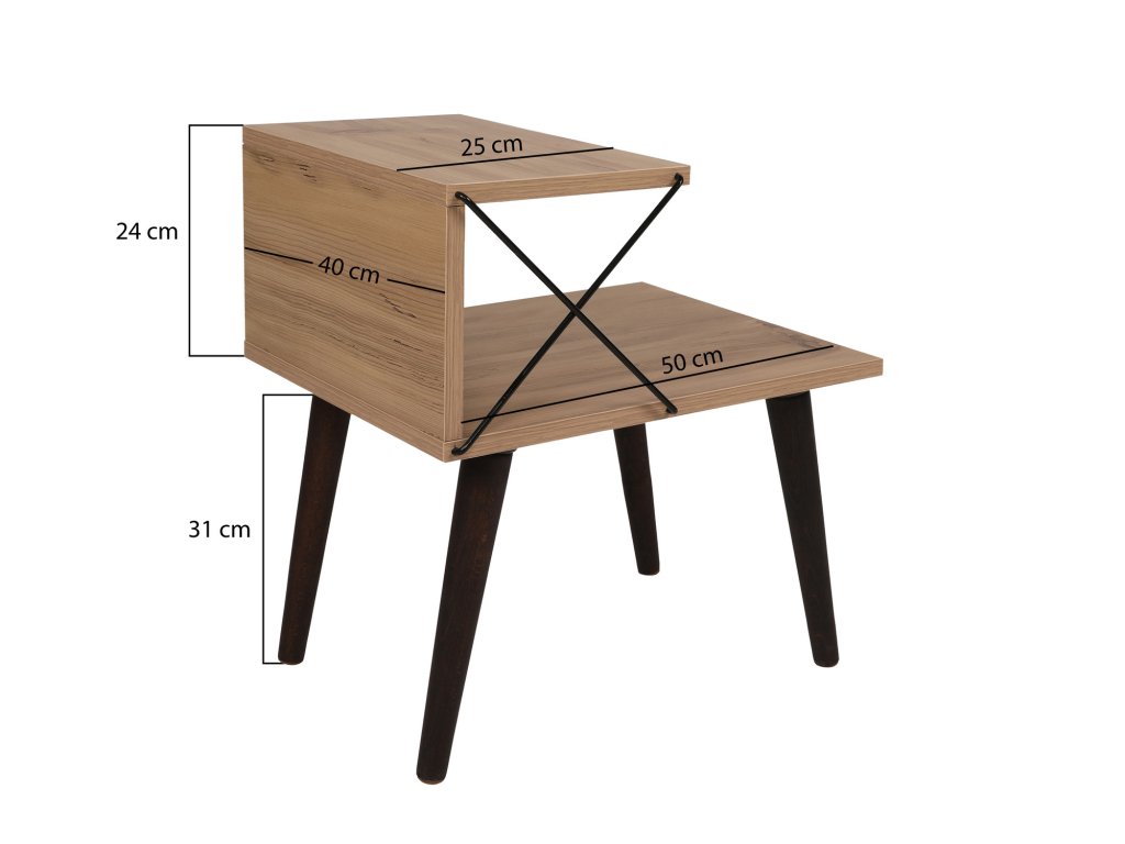 Stolek má horní police o šířce 25 cm a spodní polici o délce 50 cm, ideální pro knihy, brýle nebo jiné noční potřeby. Výška 55 cm a hloubka 40 cm se snadno vejde do každé ložnice.