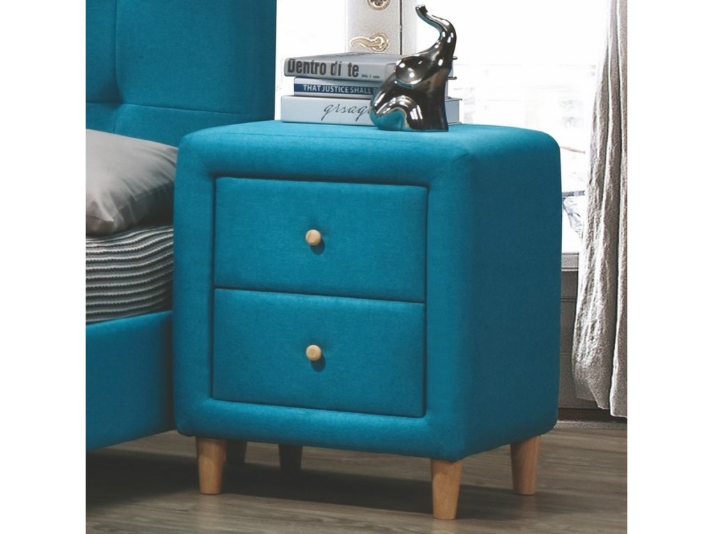 Noční stolek stylového rázu. Je čalouněný kvalitní potahovou látkou v nádherné barvě Tiffany blue tyrkys. Stolek má dvě zásuvky a stojí na dřevěných nožkách.DOPRODEJ!
