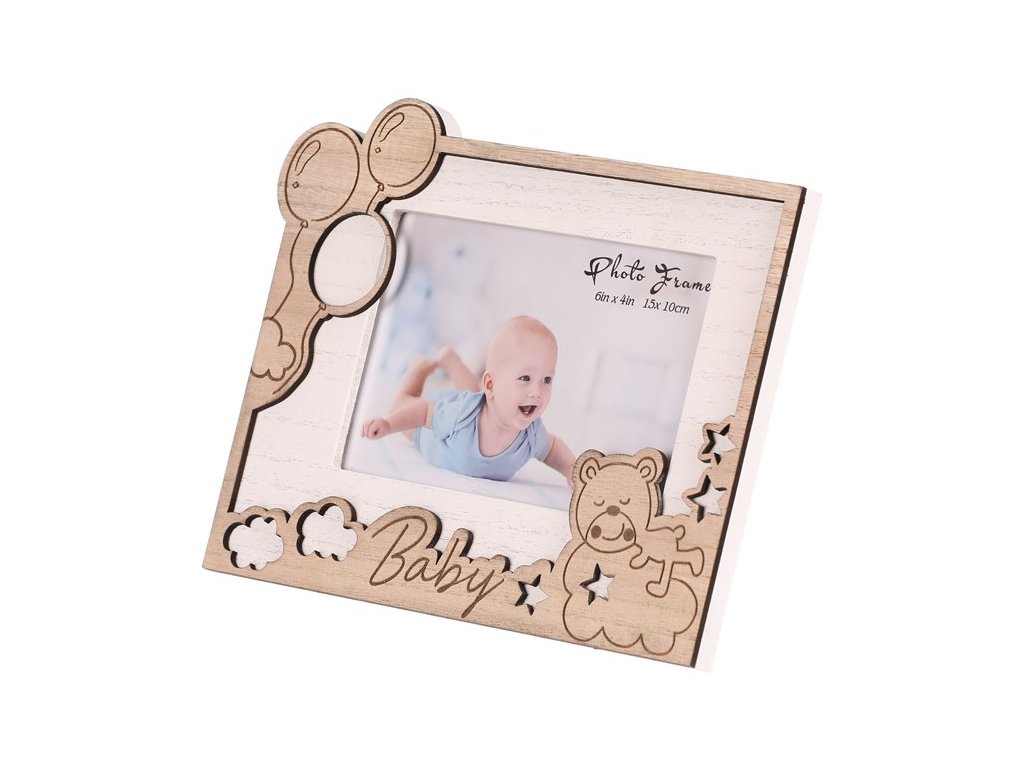 Fotorámeček s motivem medvídka a balónků je vhodný pro vystavení fotografií vašeho miminka. Vyroben z MDF v přírodní barvě dodává prostoru teplý a příjemný vzhled.