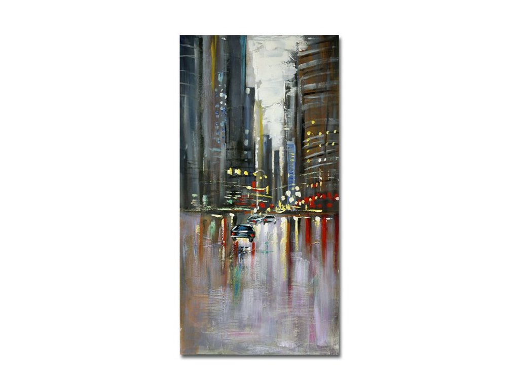 Ruční olejomalba zachycuje městskou ulici po dešti s odrazy světel. Ideální pro dekoraci interiéru, přináší dynamiku a atmosféru městského života.