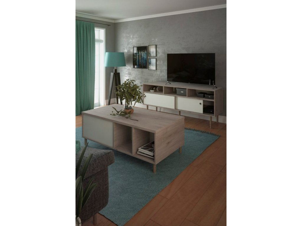 Stolek Ruby vyniká retro vzhledem s vysokými nožkami a kombinací barev hickory a bílé. Hodí se do obývacích pokojů, kde chcete doplnit interiér o stylový a zároveň funkční prvek.