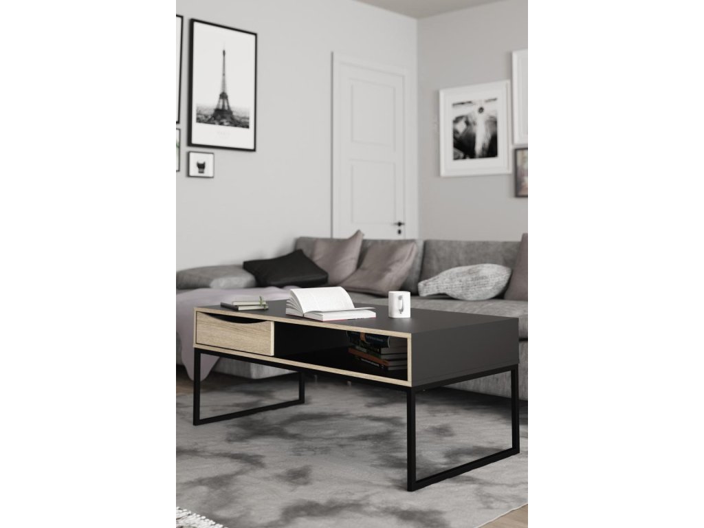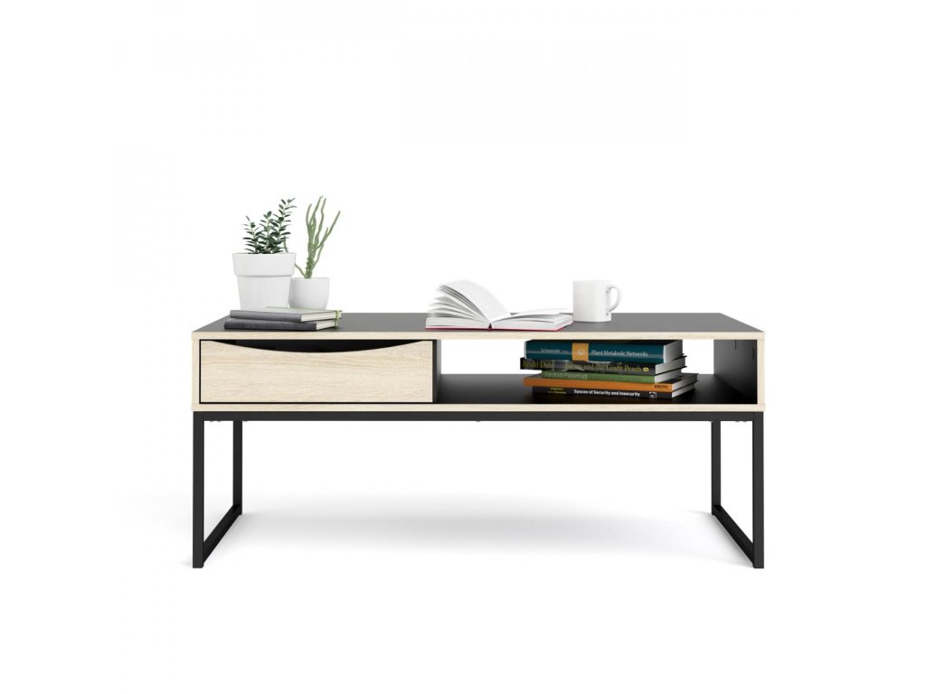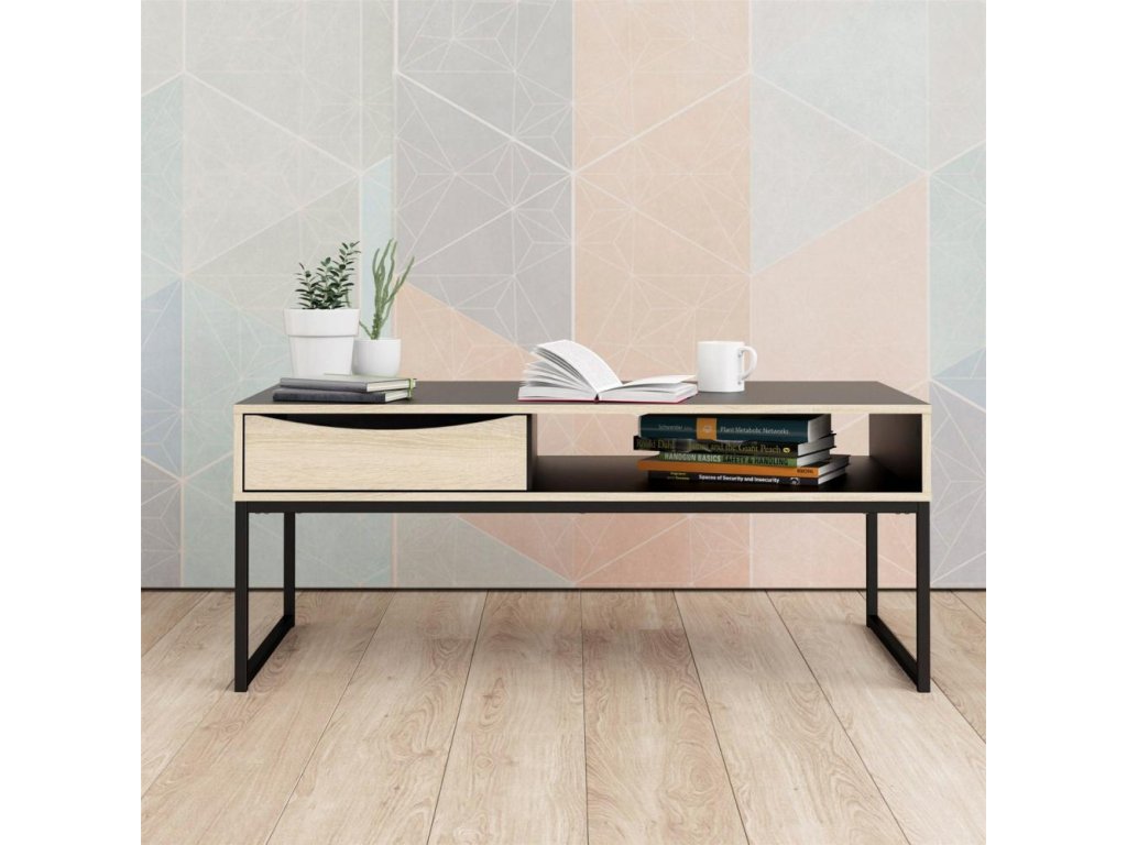 Konferenční stolek Sheba s praktickou zásuvkou je dostatečně velký na vše co si budete potřebovat odložit. Klidně i unavené nohy po celodenním maratonu. Je zhotoven z odolného a snadno udržovatelného lamina, kovový U profil dodává nádech industriálního stylu.