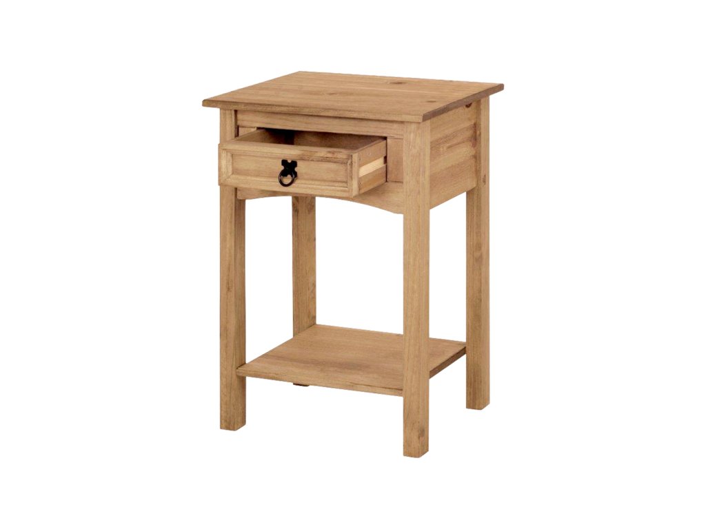 Stolek je vyroben z masivní borovice s voskovaným povrchem, který je odolný a snadno se udržuje.