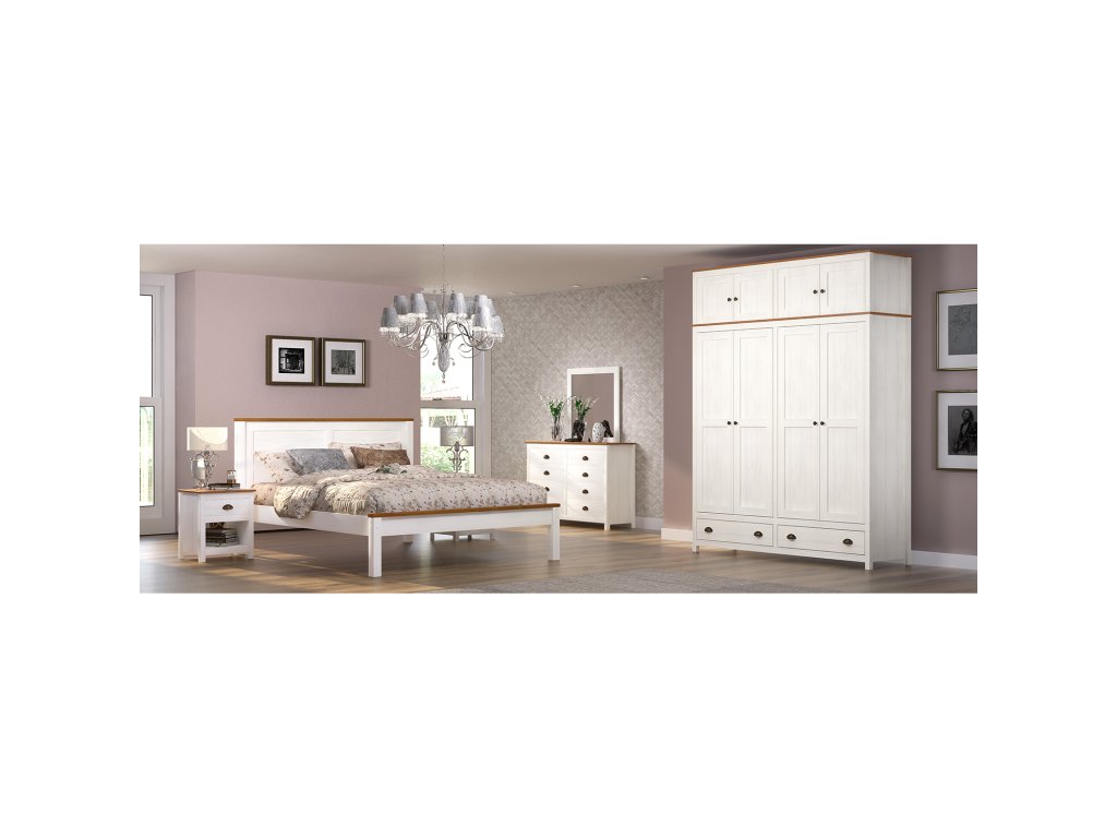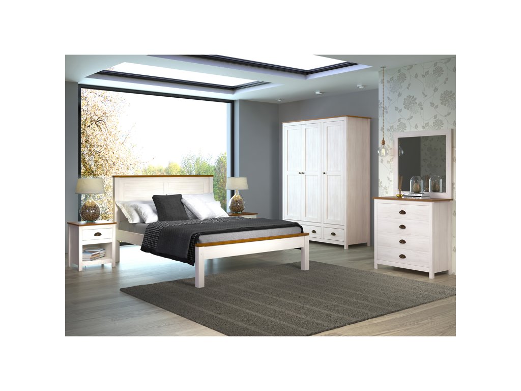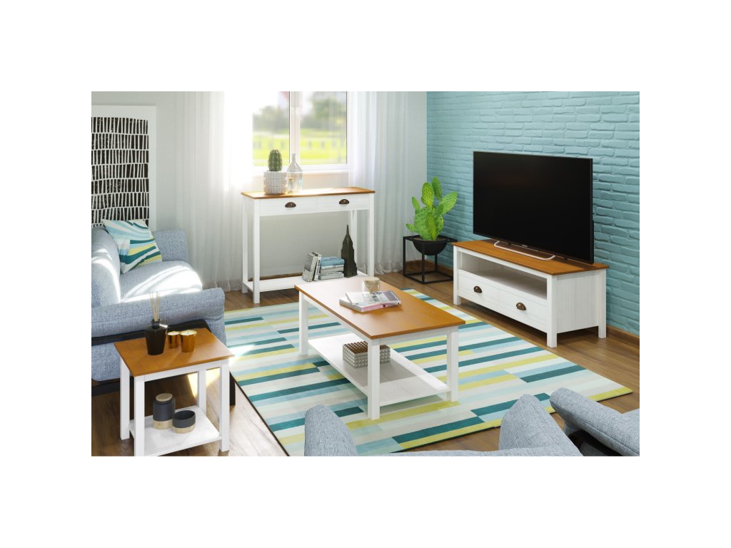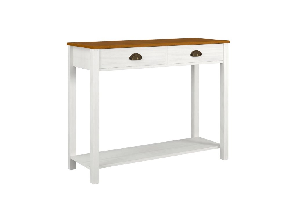 Vyroben z masivu borovice s bílým a hnědým lakem, stolek je odolný a snadno se udržuje. Kovové úchytky a pojezdy zajišťují hladkou manipulaci se zásuvkami.