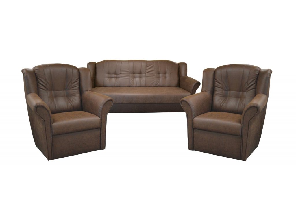 Agata je stále velmi oblíbeným klasickým modelem sedací soupravy v provedení 3F+1+1. Je velmi pohodlná a zároveň praktická. Sedací souprava je rozkládací a samozřejmostí je i úložný prostor. Jednoduchým rozkladem pomocí systému "klik klak" vznikne lůžko k příležitostnému přespání Vaší návštěvy. Sedací souprava je potažena kvalitní látkou a nabízíme ji v několika barvách, ze kterých si určitě vyberete tu nejvhodnější pro Váš obývací pokoj. Výpň sedáků tvoří pružiny v kombinaci s kvalitní PUR pěnou. Tato kombinace zajistí velmi pohodlné sezení. Cena sedací soupravy je uvedena za rozkládací trojsed a dvě křesla. Sedací souprava je potažena látkou, která imituje kůži. Látka je odolná a velmi lehce se udržuje.