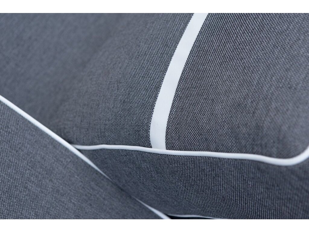 Potah z látky Inari v šedé a bílé barvě je odolný a snadno udržovatelný. Kontrastní proužek lemující sedačku i polštáře dodává moderní vzhled.