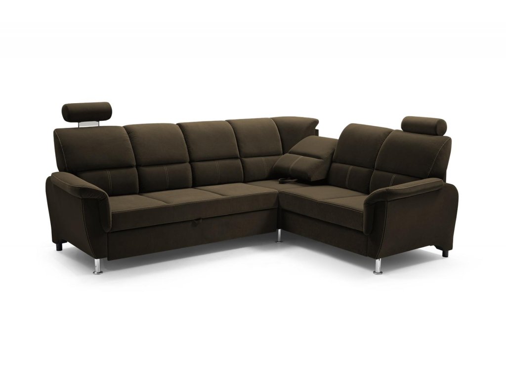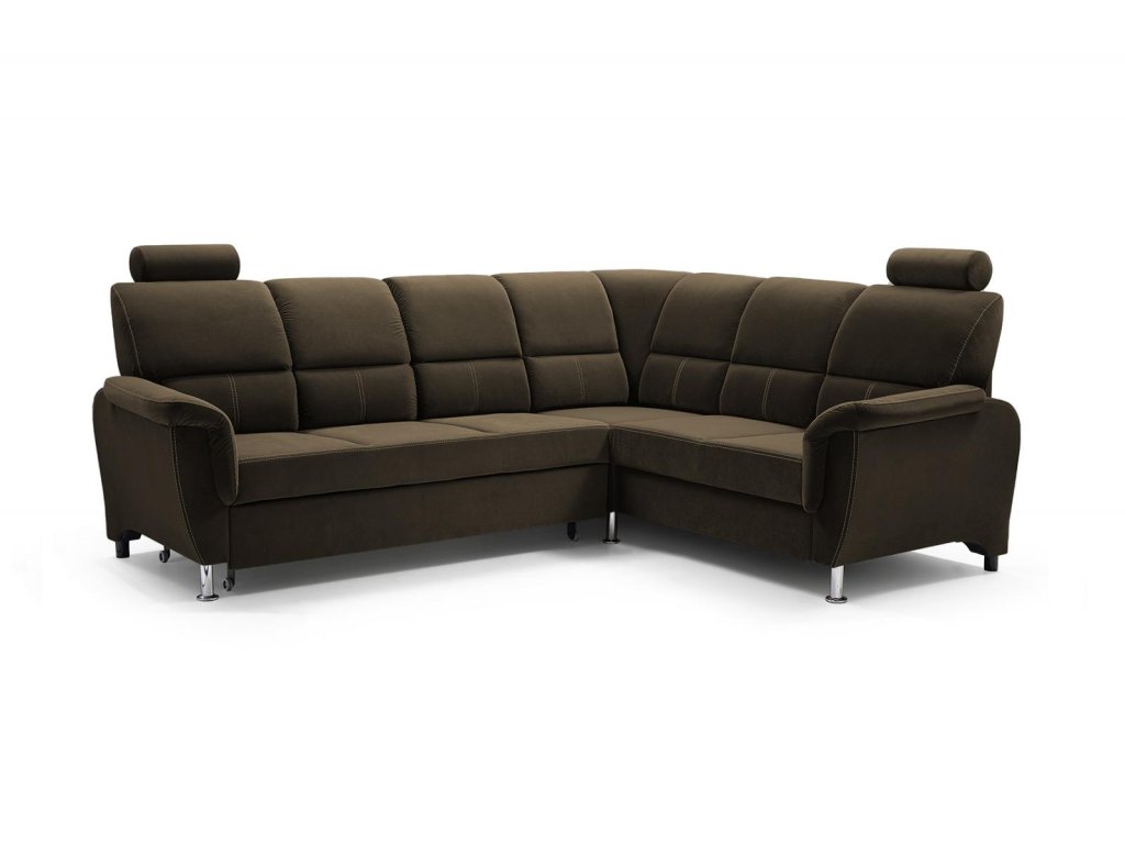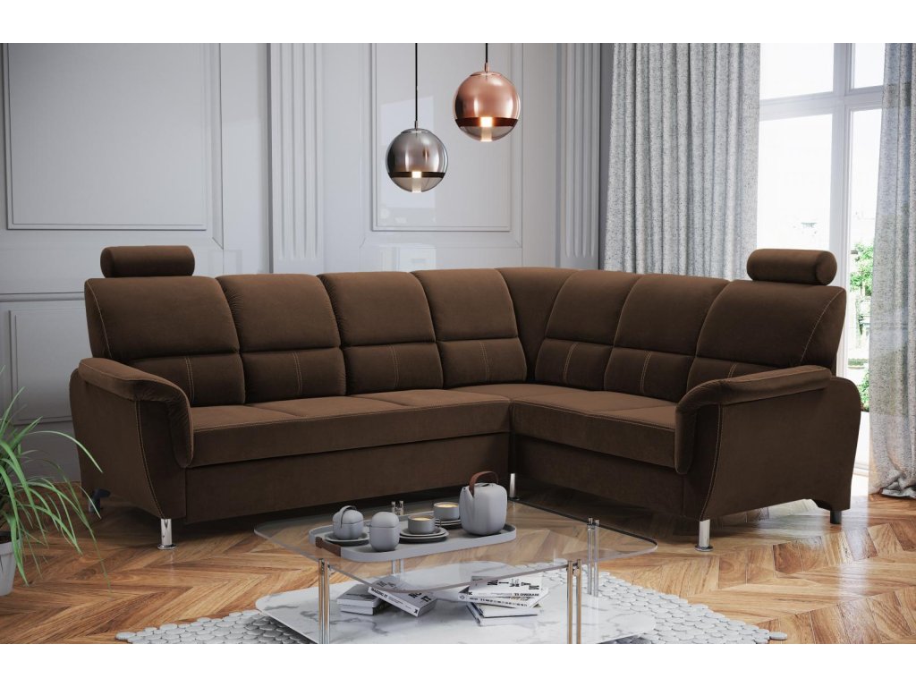 Sedací souprava je dostupná v levém i pravém provedení a v moderním hnědém provedení, které se hodí do různých stylů interiéru.
