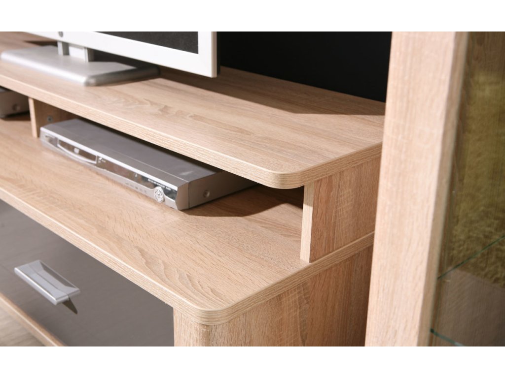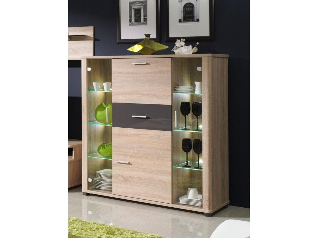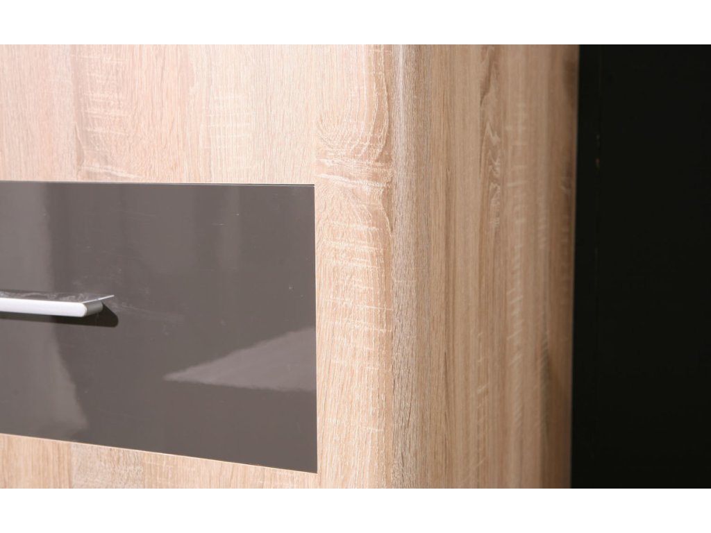 Vyrobena z kvalitního lamina odolného proti poškrábání, vlhkosti a vysokým teplotám. Povrch v kombinaci sonoma a grafit lesk dodává vitríně elegantní vzhled.