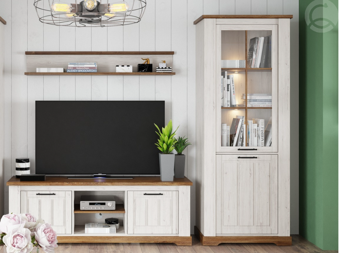 Obývací sestava patří mezi moderní prvky nábytku ve venkovském stylu. Tento styl nábytku podtrhne rustikální vzhled vašeho obývacího pokoje nebo jídelny. Sestava je vyrobena z kvalitní LTD desky v kombinaci barev borovice andersen/dub stirling. Dveře vitríny mají v horní části tvrzené sklo. Ve spodní části je dekorační podstavec v barvě dub stirling. Sestava se skládá z těchto komponentů (Š x V x H cm) - vitrína dvoudveřová (79 x 203 x 45 cm), televizního stolku (163 x 56 x 45 cm) a závěsné police (141 x 23 x 22 cm). Úchyty jsou kovové v černé barvě. Sektorový nábytek má široký výběr prvků, které můžete kombinovat dle vlastních představ. LED osvětlení vitríny není zahrnuto v ceně, je možné ho dokoupit. Dodáváme v demontovaném stavu.