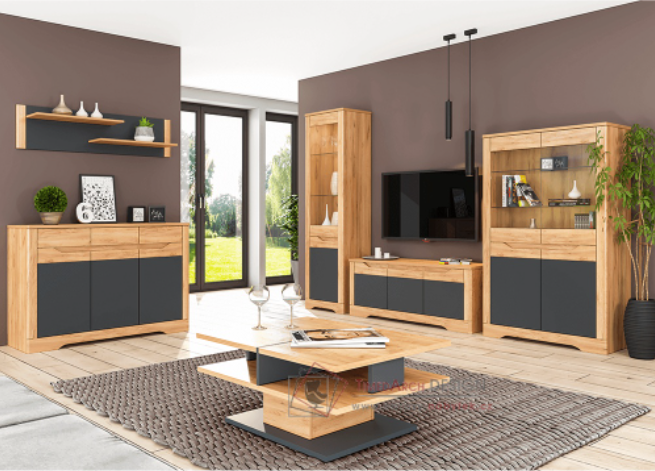 FIDEL - moderní sektorový systém vhodný na zařízení obývacích pokojů, jídelen a ložnic, materiál: DTD laminovanýá /dvířka MDF. Barevné provedení dub craft zlatý/ grafit šedá. Možnost dokoupení LED osvětlení do skleněných vitrín.