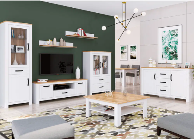 LANZETTE - sektorový systém v provensálském stylu vhodný na zařízení obývacích pokojů a jídelen, materiál : DTD laminovaná, ABS hrany. Barevné provedení bílá alba/dub craft zlatý. Možnost dopoupení LED osvětlenído skleněných vitrín.