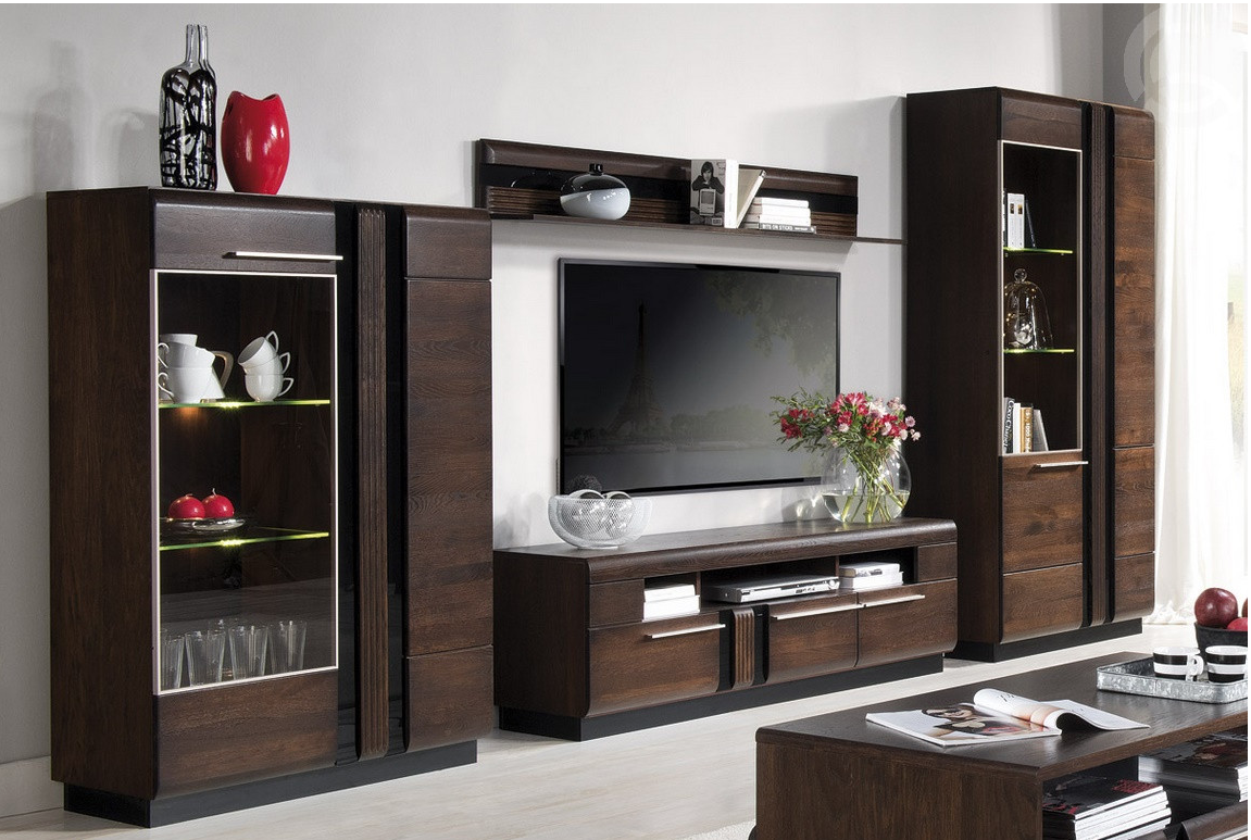 Obývací sestava z exkluzivní kolekce navržena v moderním duchu. Struktura ušlechtilého masivního dubu na přední straně a přírodní dýha na korpusu zdůrazňuje velmi klasickou barvu čokoládový dub. Opakující se prvek riflování v kombinaci s černým sklem je dekorační motiv, který se odráží v každém bloku. LED osvětlení vitrín lze dokoupit. Použitelnost alternativního spínače zjednoduší každodenní používání a osvětlený vnitřek vybraných bloků přinese ještě více energie a radosti v každodenním životě a nenápadně upozorní na povahu exponovaných prvků. Celá řada se vyznačuje elegancí a jednoduchými tvary, které zaručují plné využití prostoru. Barevné provedení - čokoládový dub. Elegantní úchyty jsou z kovu. Dodáváme ve smontovaném stavu