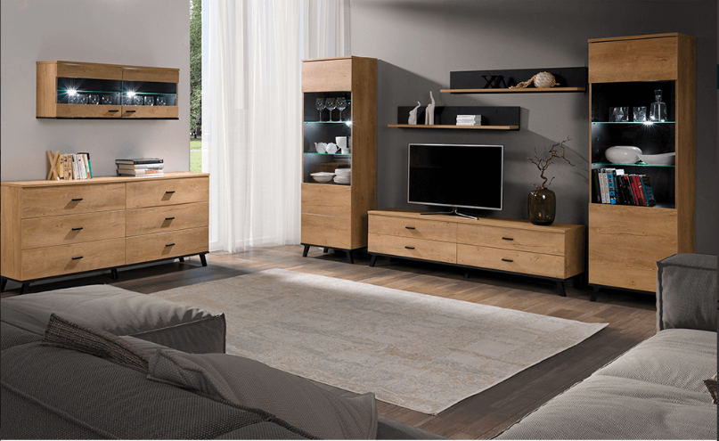 SIRAN - moderní praktický sektorový systém vhodný na zařízení obývacích pokojů, materiál : DTD laminovaná, vrchní plát a dvířka ABS hrana, barevné provedení : dub lefkas, nohy plastové barva černá. Konferenční stolek má dvířka s dotykovým systémem PUSH UP.