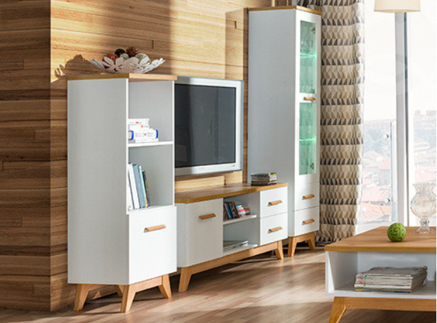 Obývací sestava stylové kolekce nábytku skandinávského stylu. Nábytek zaujme především svými dubovými nožkami a úchyty. Barevné provedení je borovice andersen v kombinaci s barevným odstínem dub nash. Nábytek je vyrobený z kvalitního lamina, hrany jsou zakončeny ABS páskou, která zvyšuje odolnost proti poškození. K vitríně je možné dokoupit LED osvětlení. Dodáváme v demontovaném stavu