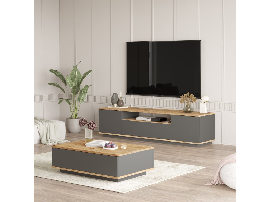 Sestava obsahuje TV stolek a konferenční stolek s rozměry přizpůsobenými pro moderní obývací pokoje, snadno se vejde do většiny prostorů.