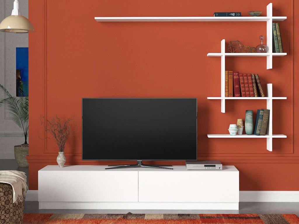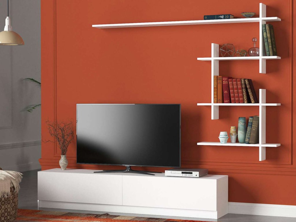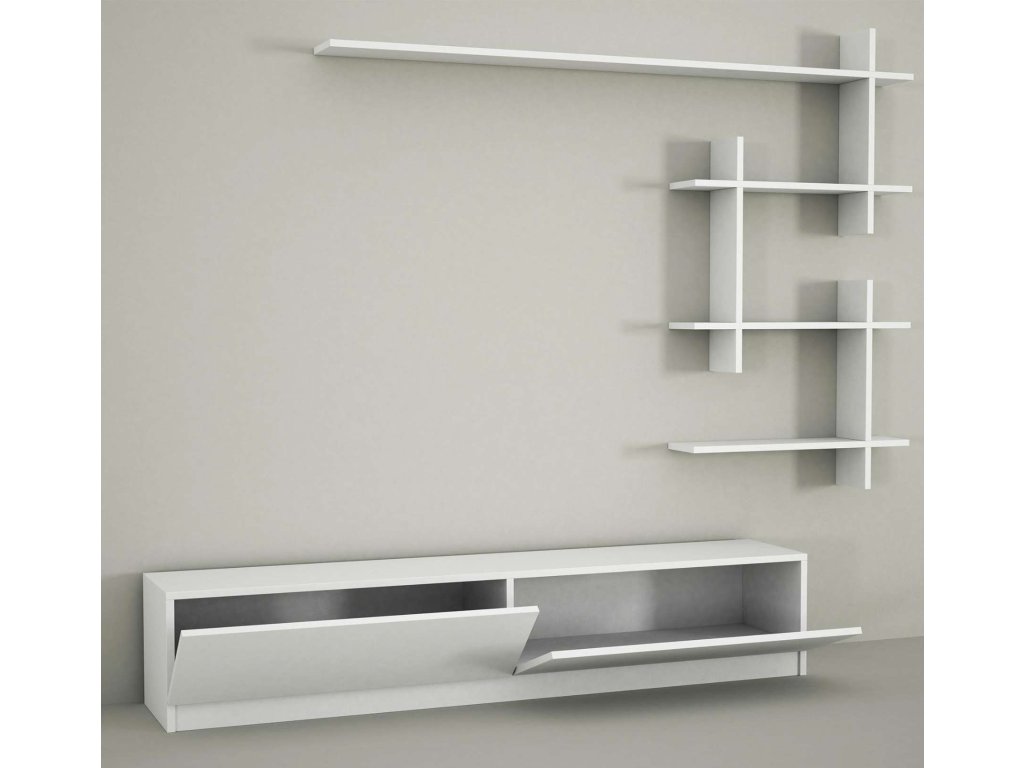 Obývací stěna obsahuje TV stolek a nástěnnou polici s rozměry přizpůsobenými pro efektivní využití prostoru v obýváku.