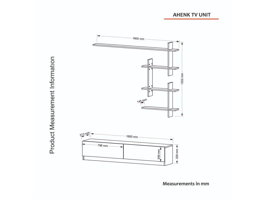- Rozměry: TV stolek (160 x 31.3 x 32.9 cm) a nástěnná police (160 x 14.5 x 130.2 cm) poskytují efektivní prostor pro uskladnění vaší elektroniky a zároveň slouží jako estetický prvek v místnosti.