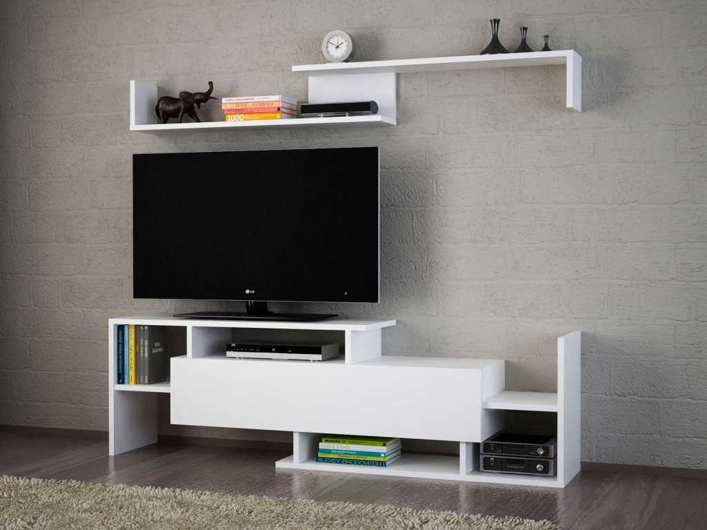 TV stolek a nástěnná police s rozměry vhodnými pro většinu domácností. Umožňuje efektivní využití prostoru a snadnou organizaci.