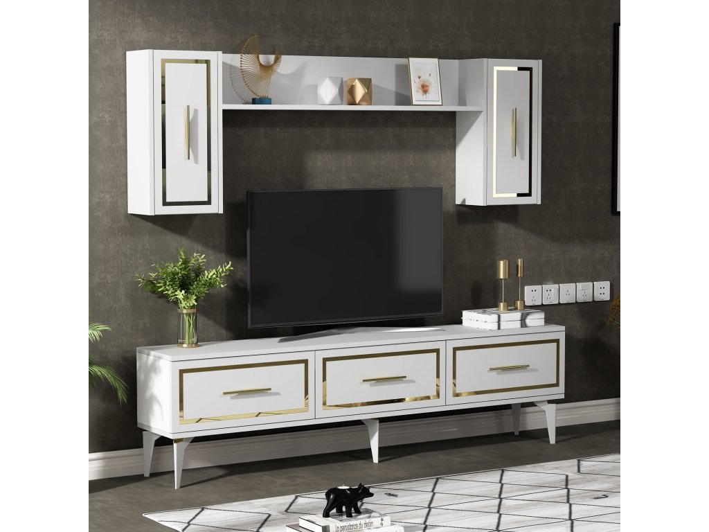 Obývací stěna FROST v bílé a zlaté barvě přináší elegantní vzhled a praktické řešení do vašeho obýváku. Obsahuje TV stolek, nástěnnou polici a závěsné skříňky, které umožňují efektivní uspořádání prostoru.