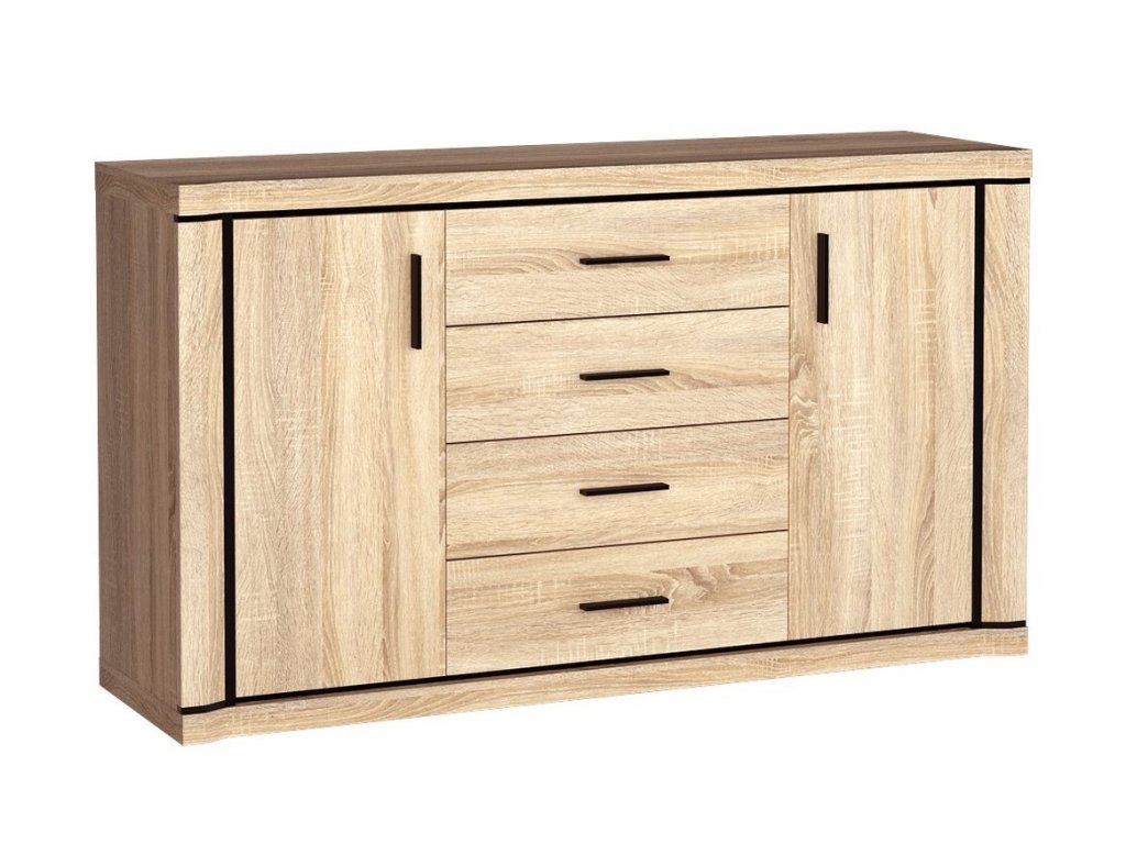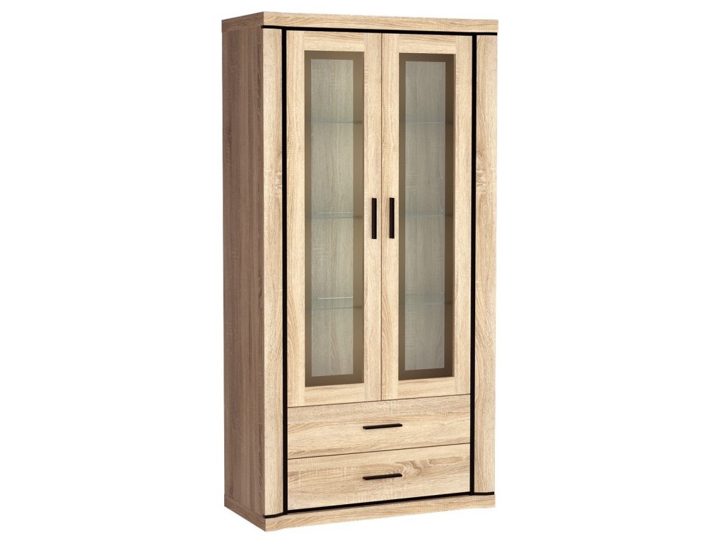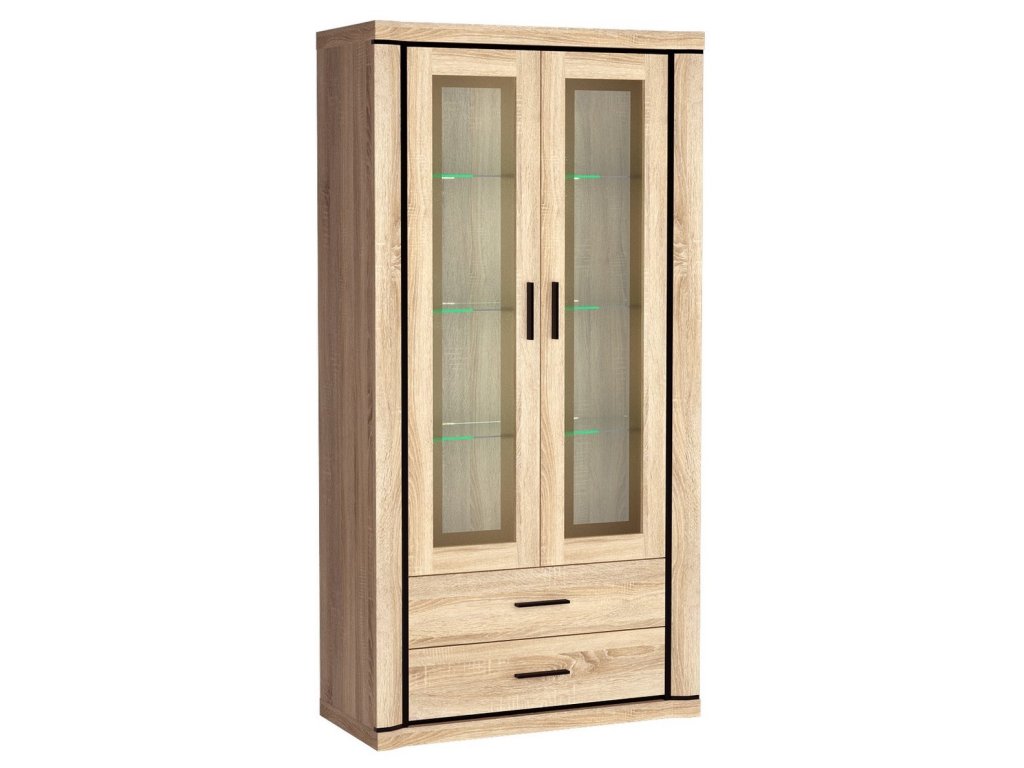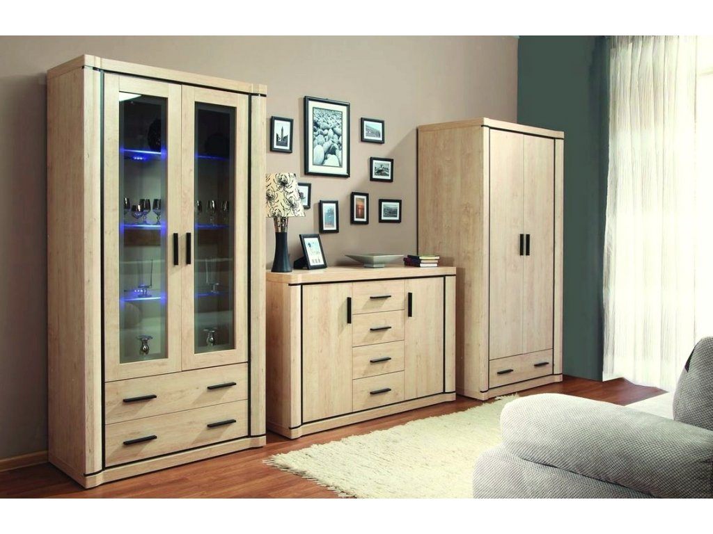 Obývací sestava z exkluzivní kolekce navržena v moderním duchu. Má zajímavé provedení v podobě netradičně vyřezávaných vrchních a spodních desek. Celá řada se vyznačuje masivním vzhledem a jednoduchými tvary. Sestava se skládá z těchto komponentů (Š x V x H cm) - vitrína dvoudveřová (97 x 192 x 43,5 cm), komody (137 x 91 x 43,5 cm) a dvoudveřové skříně (97 x 192 x 58 cm). Nábytek je vyroben z kvalitního LTD v barvě dub sonoma s lištami z MDF, součástí nábytku jsou desky 48 mm, vše opatřeno ABS páskou. Má široký výběr komponentů, díky kterým lze vybavit nejen obývací pokoj, ale i jídelnu nebo kancelář. Možnost dokoupení osvětlení. Dodáváme v demontovaném stavu.
