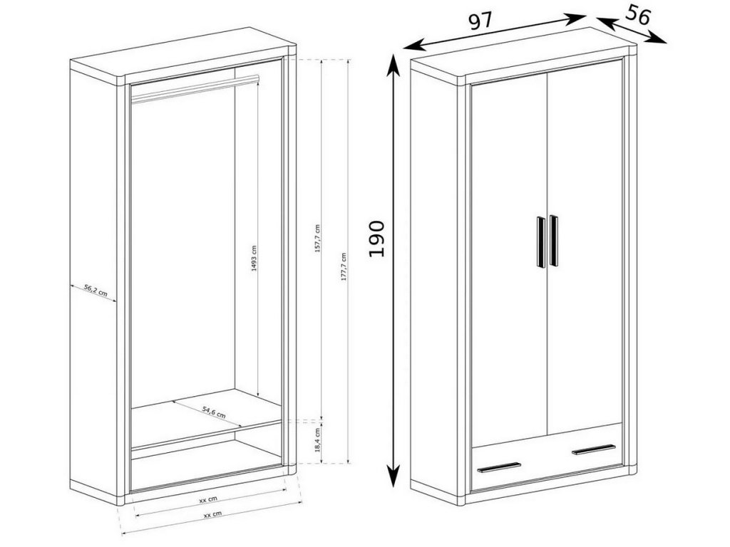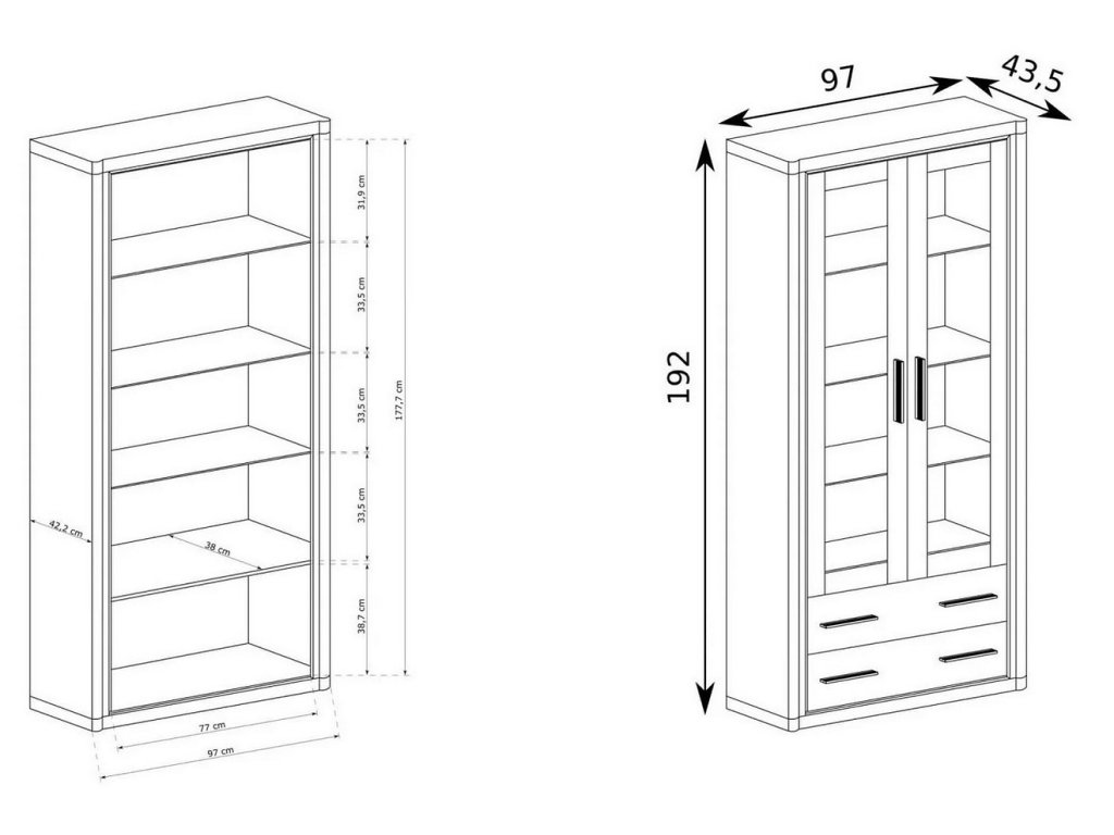 Vitrína má rozměry 97 x 192 x 43,5 cm, komoda 137 x 91 x 43,5 cm a skříň 97 x 192 x 58 cm. Tyto rozměry umožňují efektivní využití prostoru v místnosti.