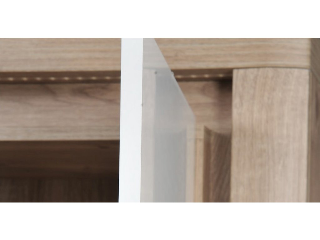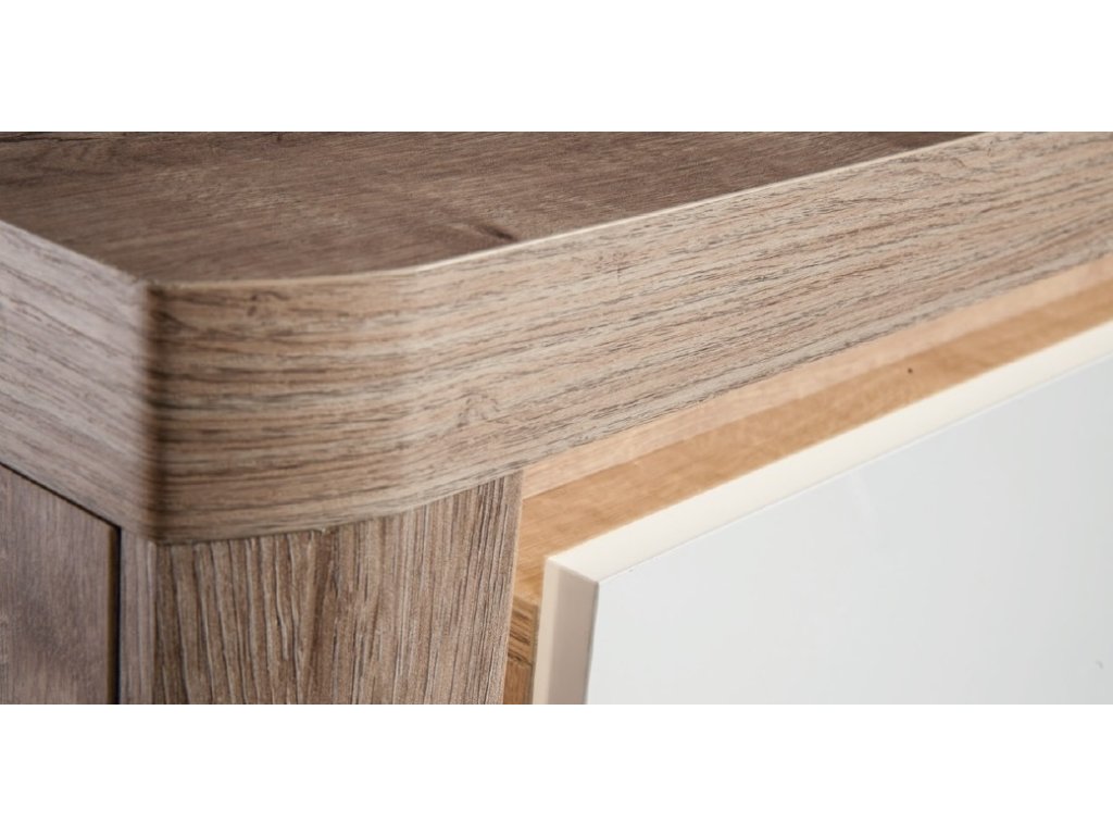 Sestava LABRO kombinuje dub ribbeck s bílým leskem pro elegantní a svěží vzhled obývacího pokoje. Bezúchytový design a LED osvětlení podtrhují její moderní styl.