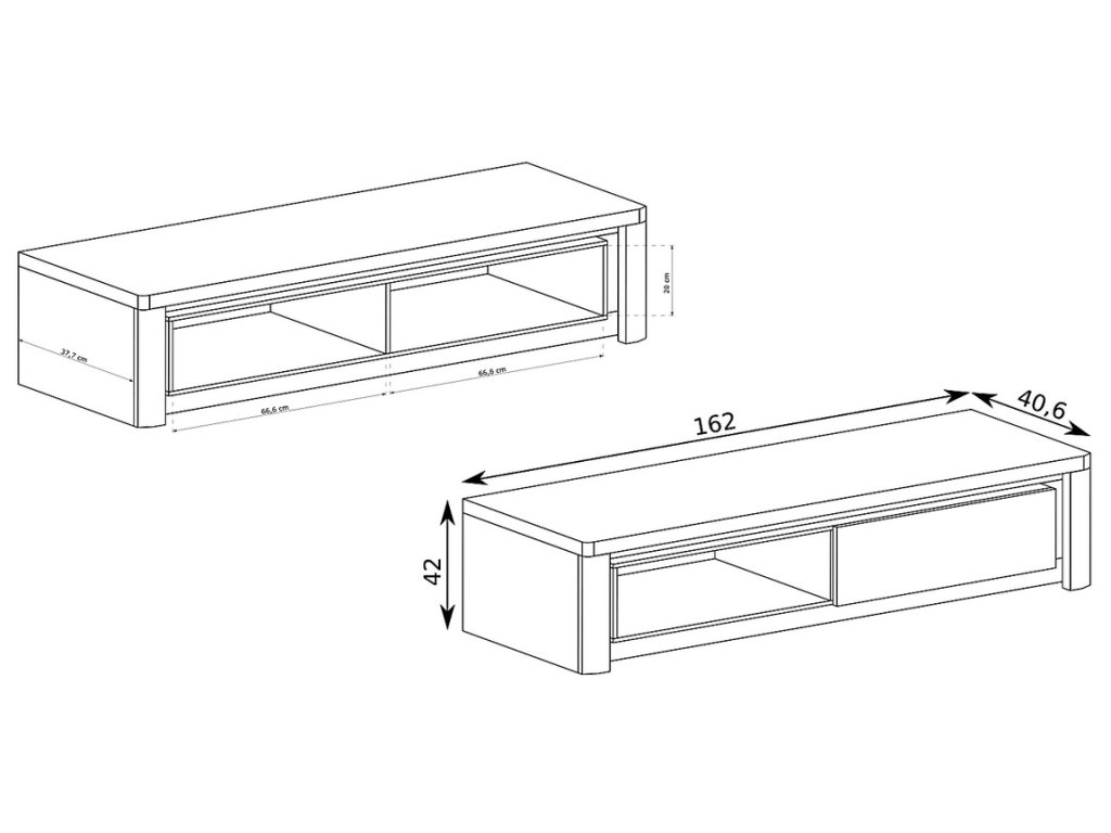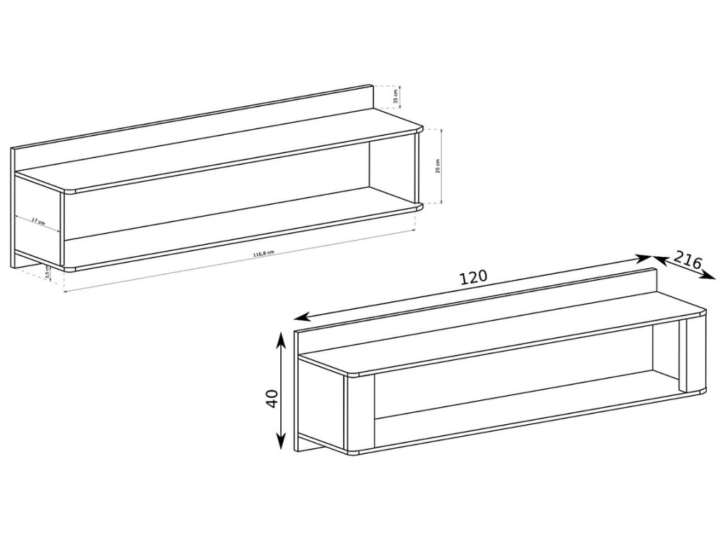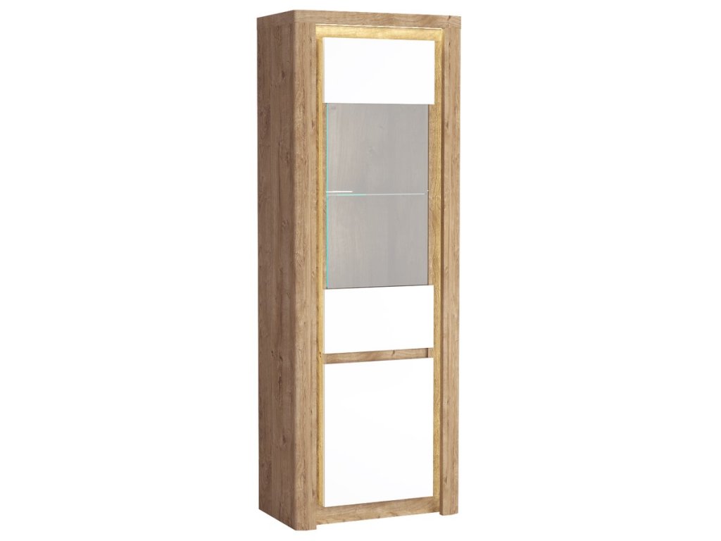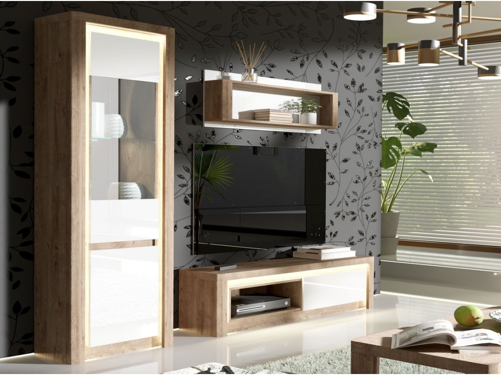 Sestava obsahuje vysokou vitrínu, televizní stolek a závěsnou polici, které nabízejí dostatek úložného prostoru i místo pro dekorace. Vitrína má univerzální otevírání a systém tichého dovírání.