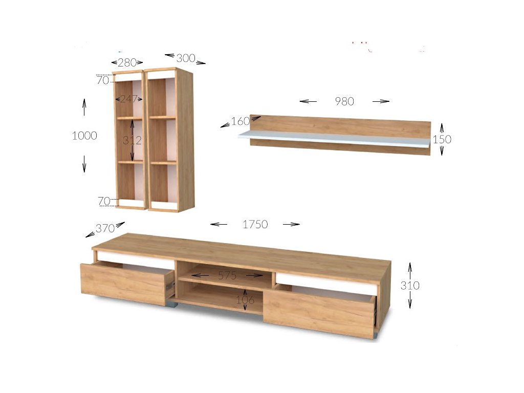 Sestava má šířku 175 cm, hloubku 37 cm a výšku přibližně 100 cm, vhodná do většiny obývacích pokojů.