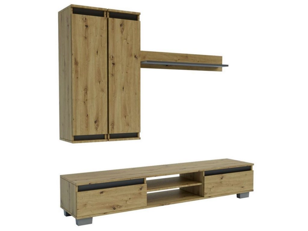 Obývací stěna Ohio kombinuje dub artisan s grafitovými detaily, ideální do moderního obýváku. Nabízí praktické úložné prostory a jednoduchou údržbu.