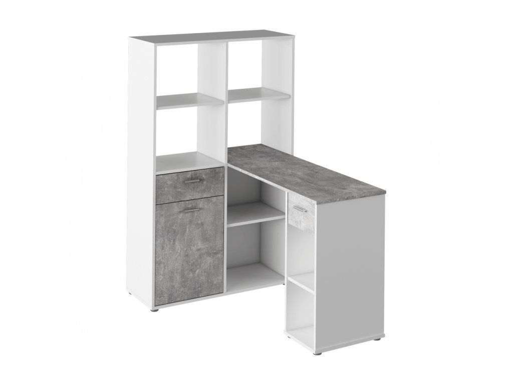 Rohový PC stůl s regálem, bílá / beton, MINESON